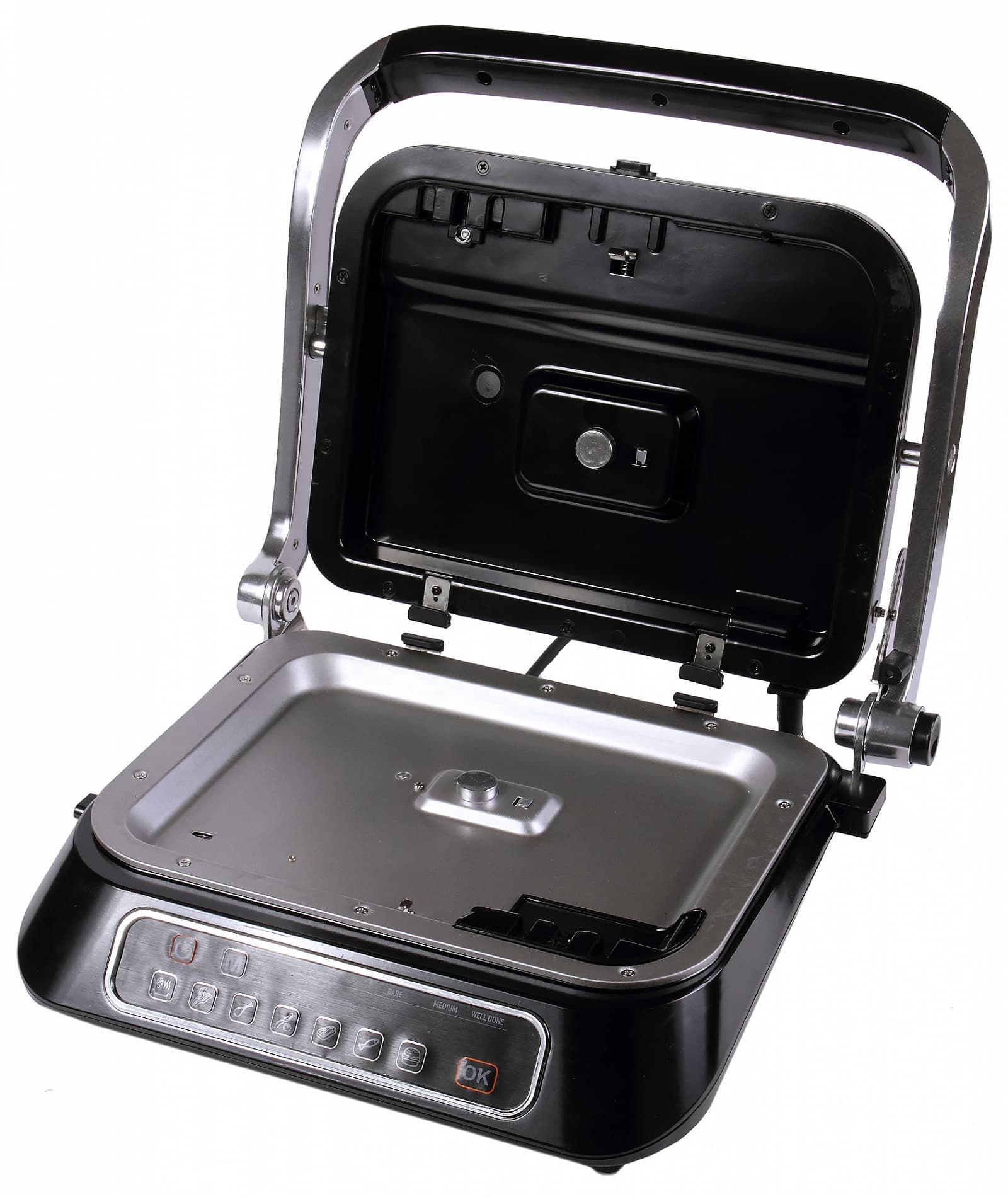А вот у более «продвинутых» моделей электронное управление открывает доступ к дополнительным функциям, самая интересная из которых, на наш взгляд — автоматический выбор режима прожарки в зависимости от типа продукта и его толщины. Такой умный гриль автоматически замерит толщину куска мяса и автоматически подберет наилучшее сочетание температуры и времени приготовления.