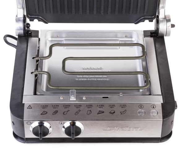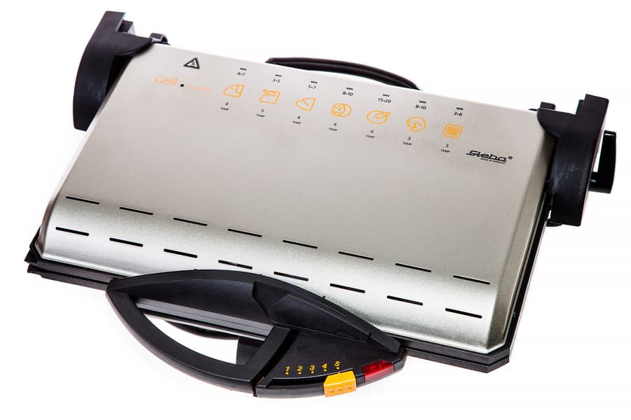 Домашние контактные грили очень похожи между собой: они имеют две панели, одна из которых закрепляется на откидывающейся крышке. Под панелью прячется нагревательный элемент и датчик температуры. Панель управления, как правило, состоит из ручек регулировки температуры и таймера (хотя тут возможны варианты).