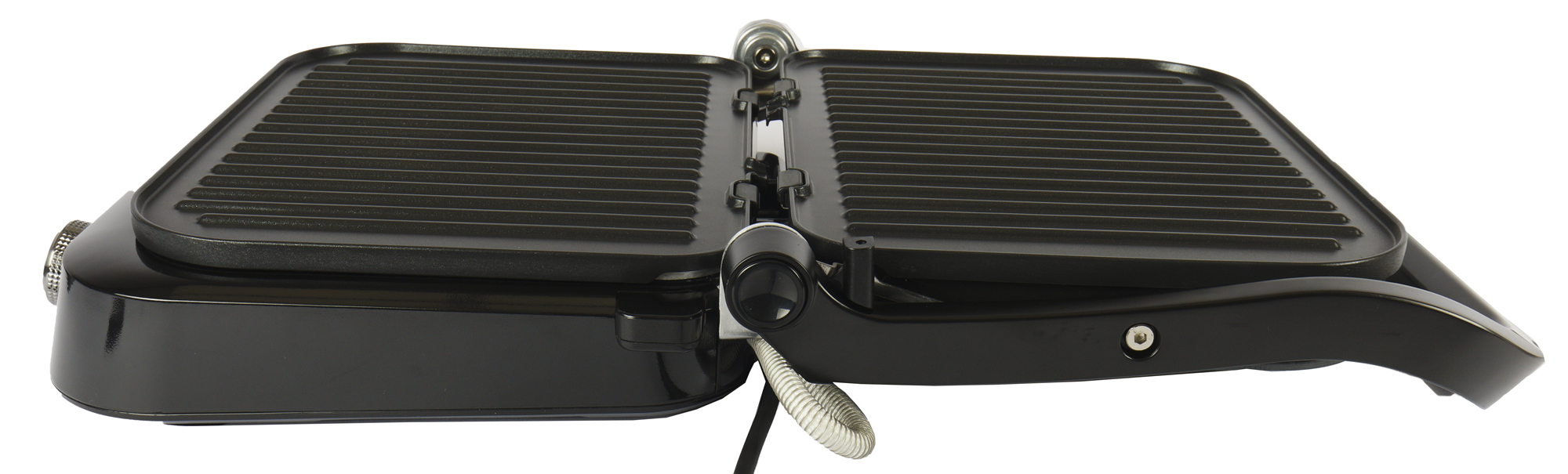 Как и более серьезные модели, гриль раскрывается на 180 градусов, позволяя готовить в режиме барбекю. Панели съемные, взаимозаменяемые, с антипригарным покрытием. Нагревательный элемент расположен на корпусе прибора.