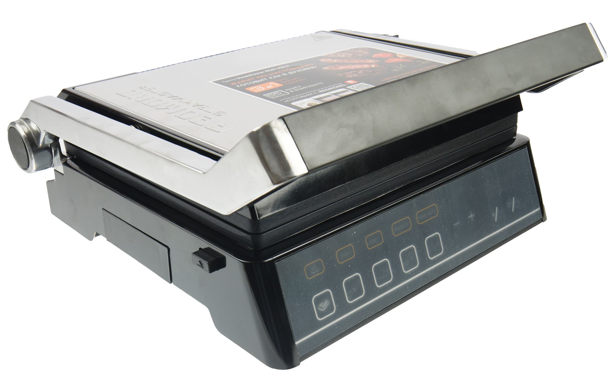 Устройство, относящееся к типу контактных прижимных грилей, оснащено тумблером, с помощью которого можно зафиксировать крышку на одном из пяти уровней, а также раскрыть панели на 180°. От прибора подобного уровня мы ждали одновременно легкости в эксплуатации и безупречного качества приготовленных блюд.
