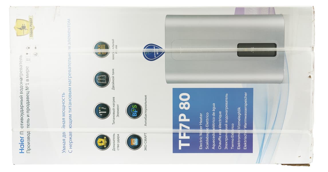 На упаковке приведены цветные фотографии прибора и перечислены основные особенности модели. Отметим, что тексты, переведенные на русский язык, грешат некоторыми неточностями: так, водонагреватель назван «противоударным», а среди его достоинств упомянуто некое «доказательство удара». Поразмыслив, мы поняли, что здесь имеется в виду система защиты от удара электротоком — фирменная технология ShockProof.