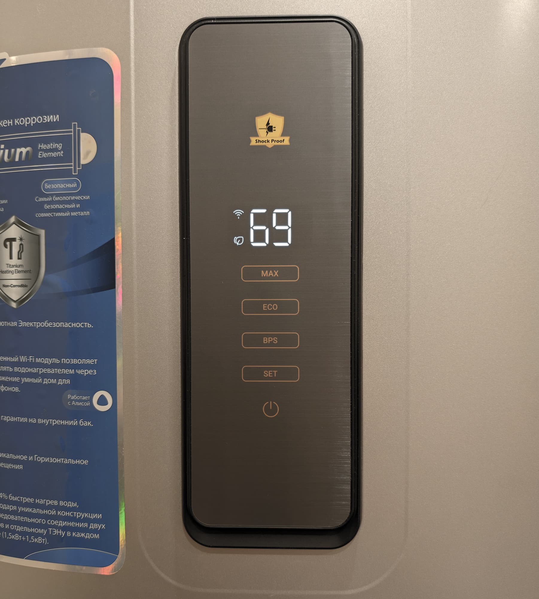 Цифры на дисплее отображают при работе текущую температуру воды внутри бака, а в процессе настройки — целевое значение. Справа и слева от них расположены индикаторы режимов работы, включения тэнов и активности беспроводного сетевого интерфейса.