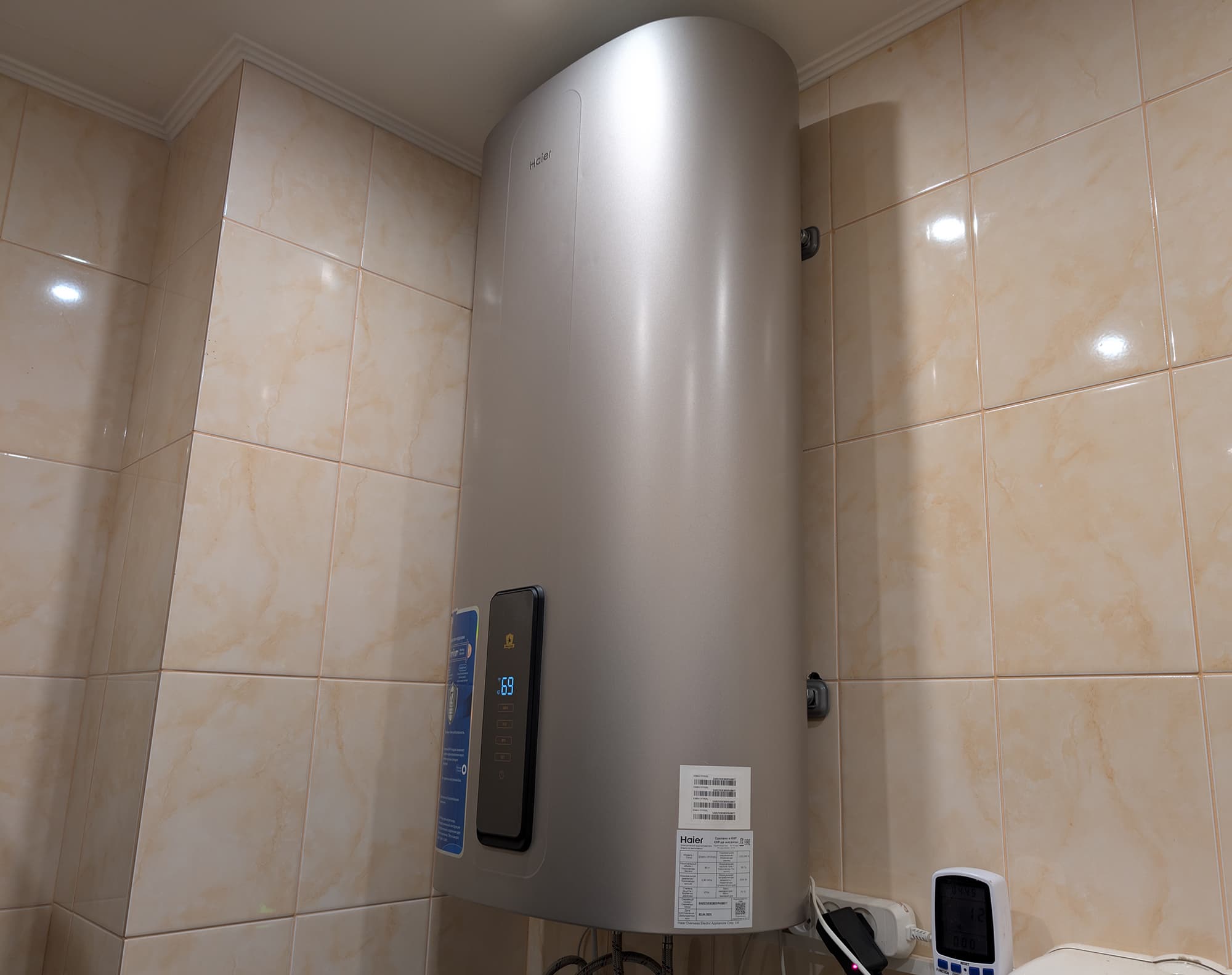 Чтобы измерить, за какое время вода в бойлере достигнет максимальной температуры, мы заполнили бак водопроводной водой с температурой около 20 °C, включили нагреватель в режиме «Max» на полную мощность и засекли время. В течение этого теста раз в секунду производились измерения потребляемой прибором мощности.