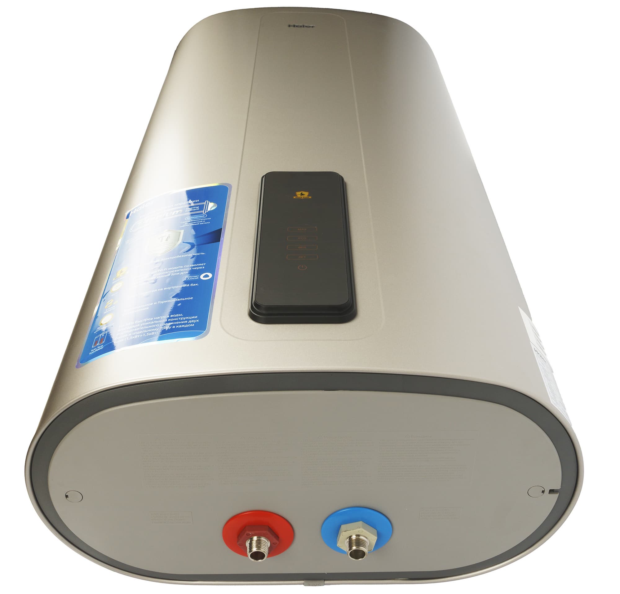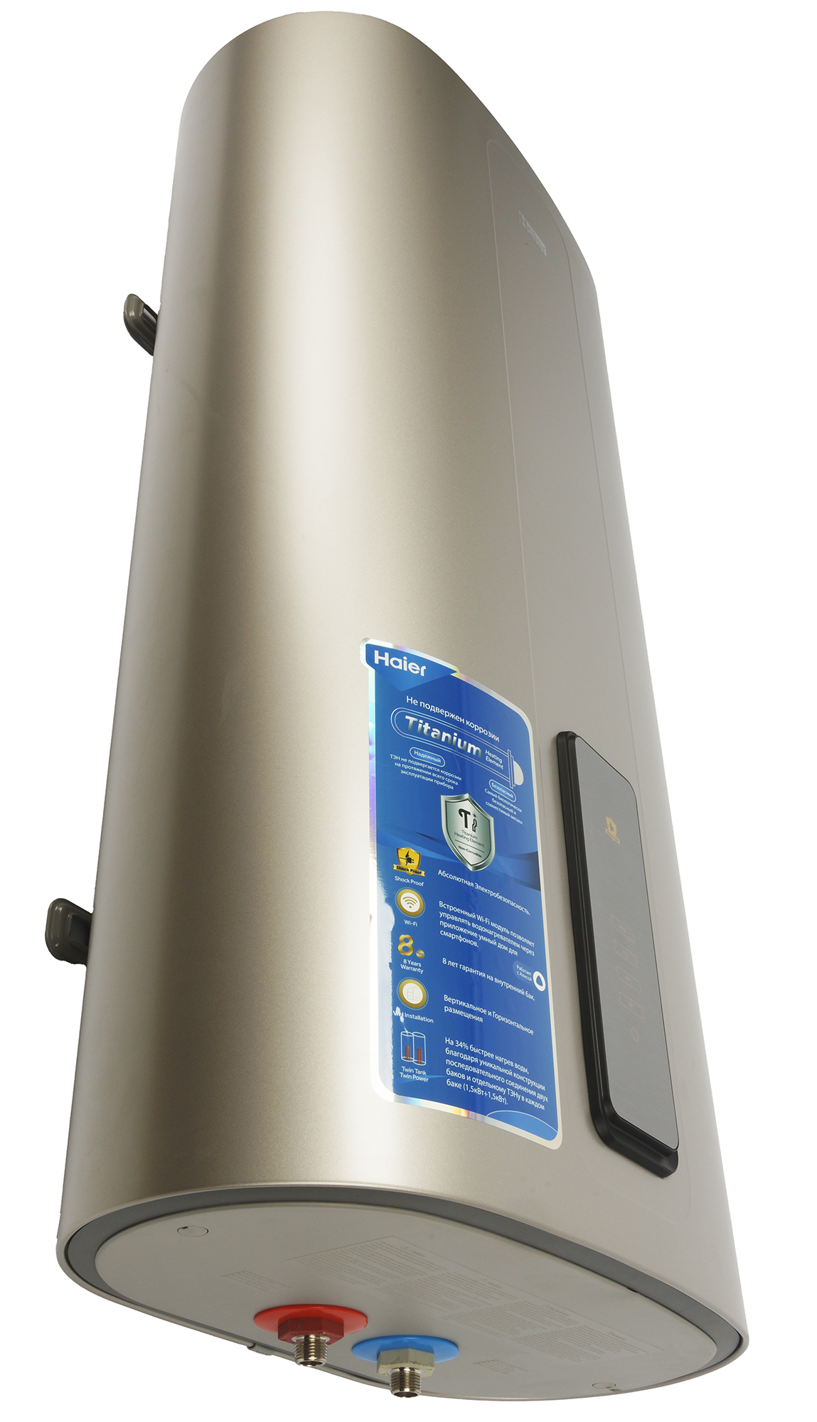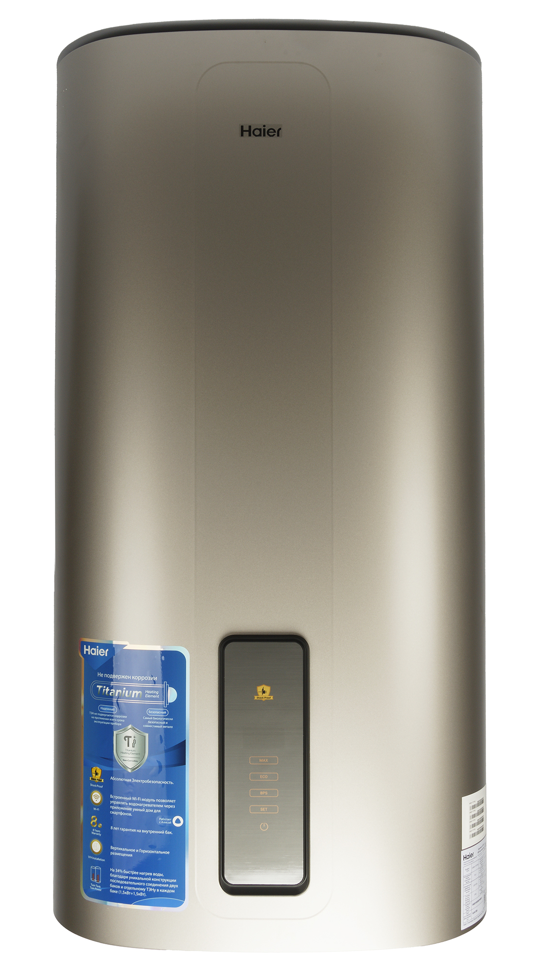 80-литровый накопительный водонагреватель Haier ES80V TF7P(R) оборудован двумя титановыми тэнами, размещенными в двух последовательно соединенных баках. Такая конструкция, по замыслу производителя, обеспечивает эффективный и быстрый нагрев воды, а также хорошую экономичность.