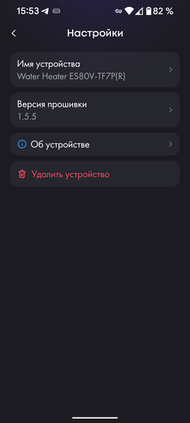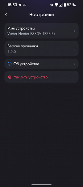 В разделе настроек приложение позволяет переименовать прибор, проверить версию и обновить встроенную прошивку, получить дополнительную информацию о бойлере и удалить информацию о приборе, если его эксплуатация завершена.