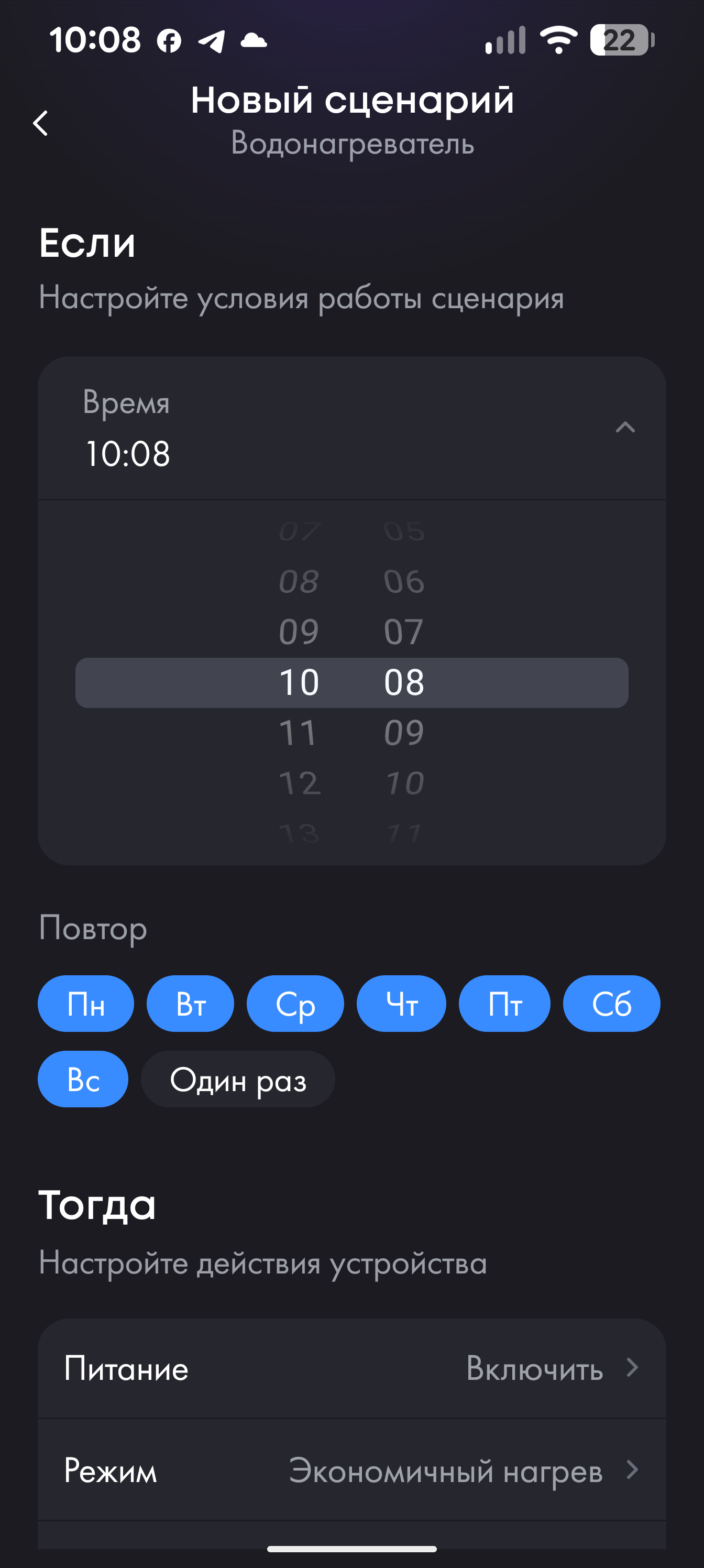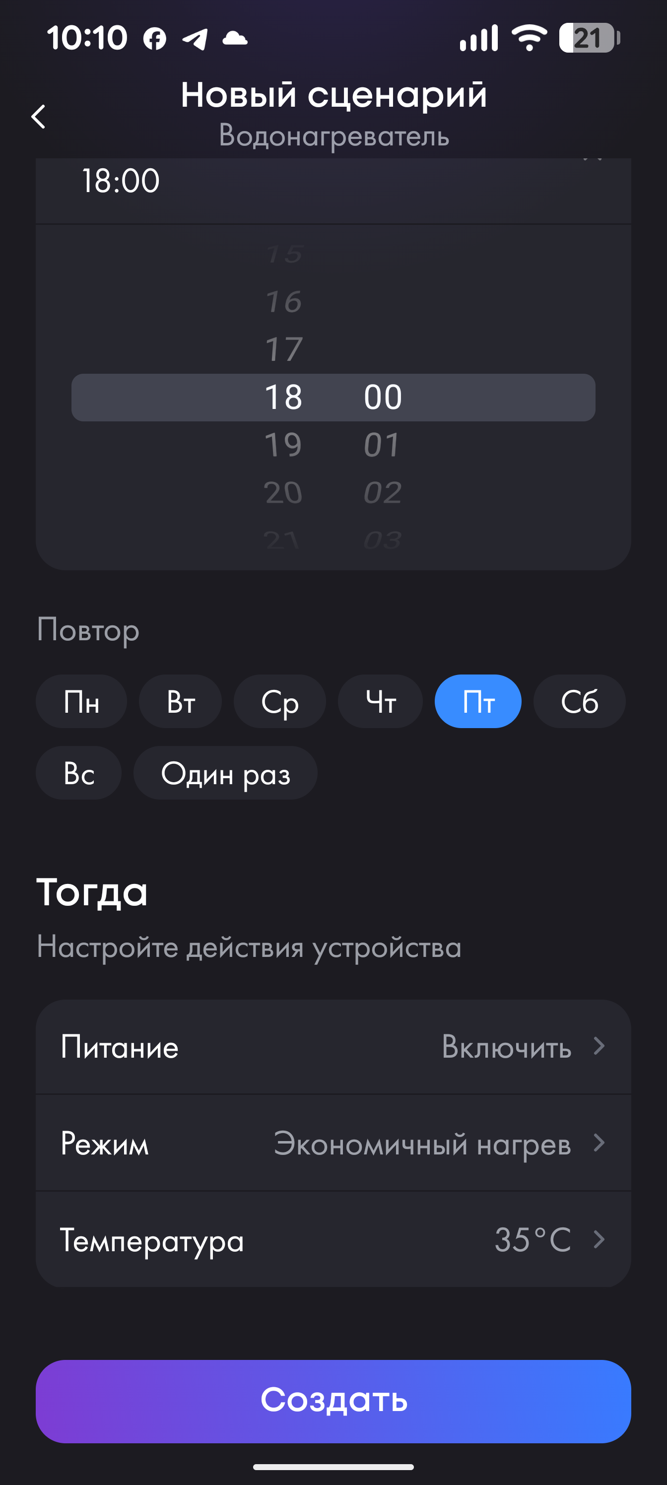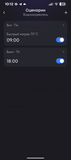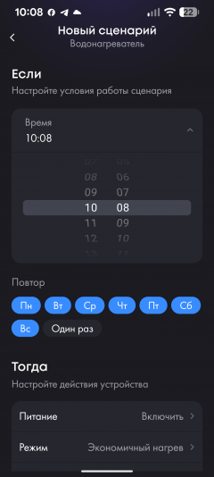Функция «Сценарии» позволяет запрограммировать устройство в зависимости от времени суток и дня недели: здесь можно выбрать нужный режим работы, установить нужную температуру, включить или полностью выключить нагрев. Тестируя водонагреватель в нашем офисе, мы воспользовались этой возможностью, настроив Haier ES80V так, чтобы он выключался в 18:00 пятницы и снова включался в максимальном режиме утром понедельника: в выходные дни горячая вода нам не требуется.