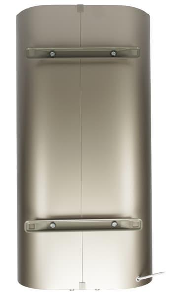 На задней стенке накопителя мы видим два кронштейна для подвешивания на стену. Из нижней части выходит электрический провод с евровилкой. Привычного устройства защитного отключения на кабеле нет: наш бойлер оборудован фирменной технологией Shock Proof, оберегающей пользователя от удара током. Как сообщает производитель, в случае утечки тока (при, к примеру, пробое тэна) система принимает наибольшую часть напряжения на себя и понижает смертельно опасный рабочий ток до безопасного значения. Согласно информации от разработчика, ток утечки в самой неблагоприятной ситуации не превышает 3,35 мА. Напомним, что порог опасного воздействия переменного тока на человека составляет от 10,5 мА (для женщин) до 15 мА (для мужчин).