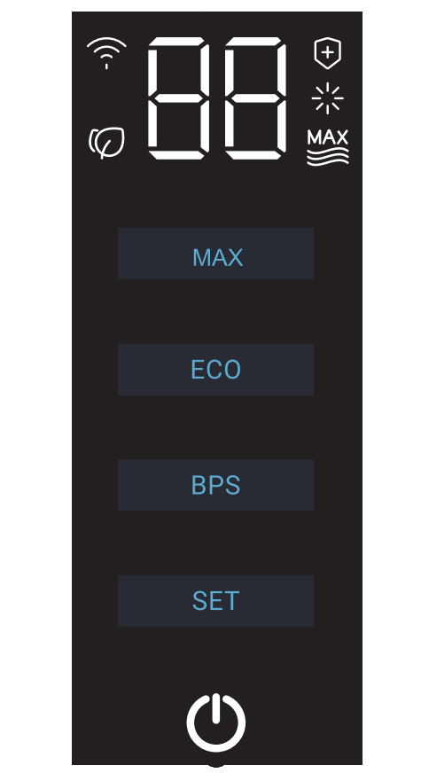 Сенсор «Set» позволяет установить желаемую температуру воды. Последовательными нажатиями выбирается значение от 35 до 75 °C с шагом в 5 °C.