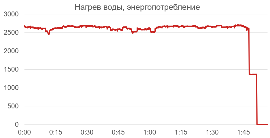 Заданной температуры (75 °C) вода в баке достигла через 1 час 48 минут. В последние несколько минут работы в этом режиме прибор работал на половинной мощности: это заметно на графике.