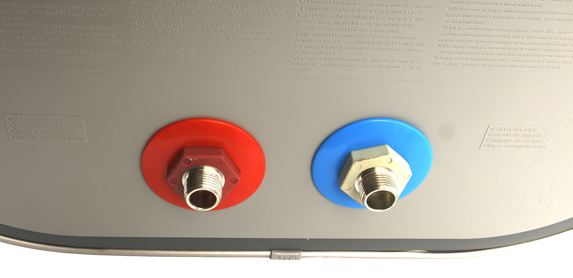 На нижней панели размещаются два стандартных штуцера с наружной резьбой G 1/2″. Правый (если смотреть с лицевой стороны) предназначен для ввода холодной воды, левый — выходной, для горячей. Они помечены цветными пластиковыми шайбами: перепутать тут сложно.