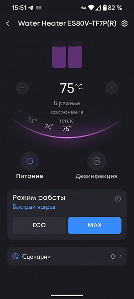На главном экране устройства мы видим установленное значение целевой температуры и можем изменить его с шагом в 1 °C (а не в 5 °C, как на панели управления). Здесь же мы можем изменить режим работы бойлера, воспользовавшись кнопками «Max», «Eco» и «Дезинфекция», перевести прибор в режим ожидания или создать сценарий управления для системы умного дома.