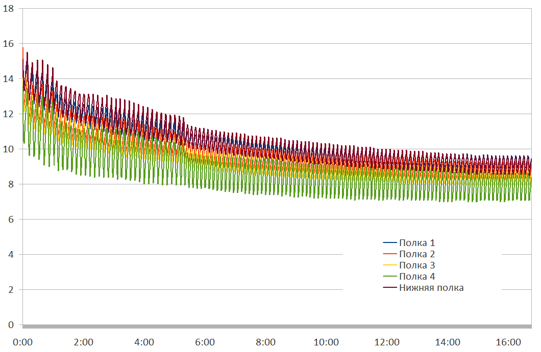 Температура в камере плавно снизилась с комнатной до установленной, стабилизировавшись через 16 часов с начала теста. Разброс средних показаний термодатчиков оказался весьма невелик: разница между самой «теплой» и самой «холодной» полкой составила около 1,3 °C. Весьма впечатляющий результат: мы знаем по опыту, что разница температур на разных полках обычного бытового холодильника зачастую превышает 10 °C.