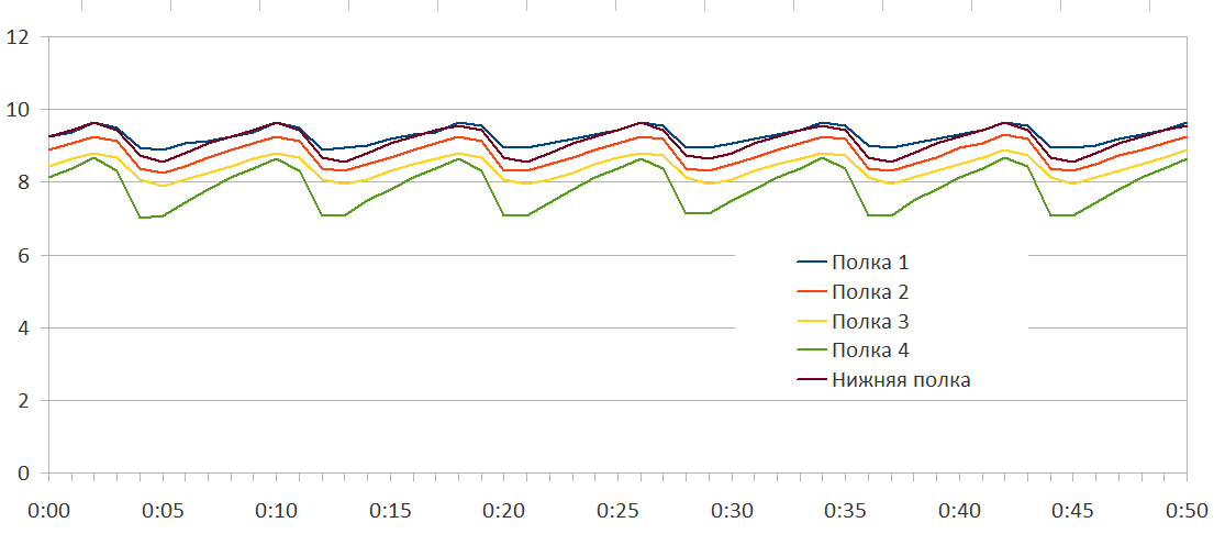 В конструкции используется классический компрессор типа on/off: регулировка температуры внутри камеры осуществляется запуском и остановкой двигателя. Еще одно отличие логики работы нашего шкафа от привычного холодильного агрегата заключается в весьма коротком периоде включений и выключений компрессора. На увеличенном графике можно видеть, что он не превышает пяти минут.