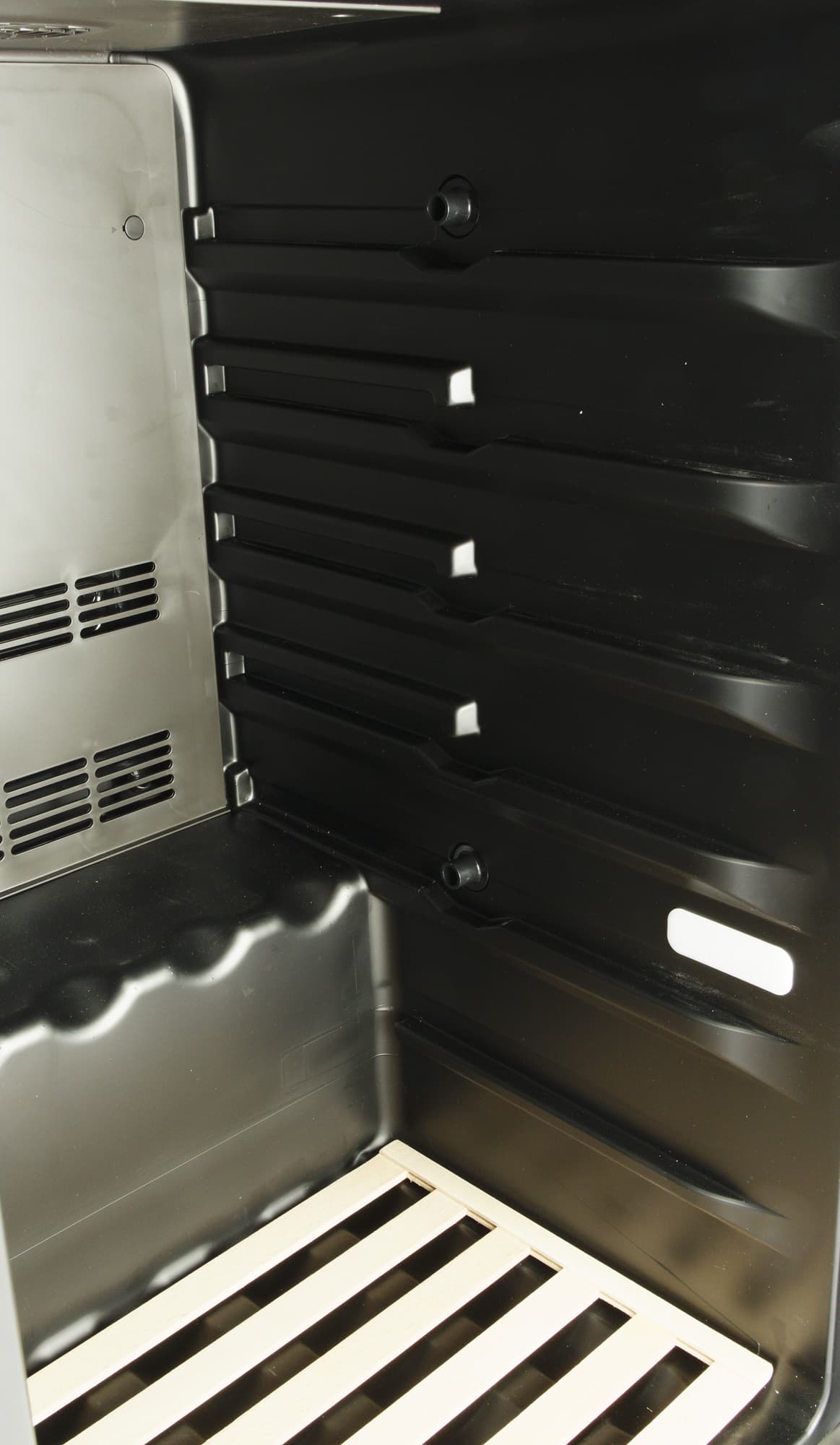 Строгий дизайн устройства позволит ему гармонично вписаться в любой интерьер. Дверца с защитой от УФ-лучей обеспечивает сохранность вина и внешнего вида бутылок. Деревянные полки предохраняют от образования конденсата, снижают и без того весьма невысокую вибрацию и, что немаловажно, не выделяют посторонних запахов. Поддерживает чистоту воздуха в шкафу и угольный фильтр, поглощающий ненужную органику.