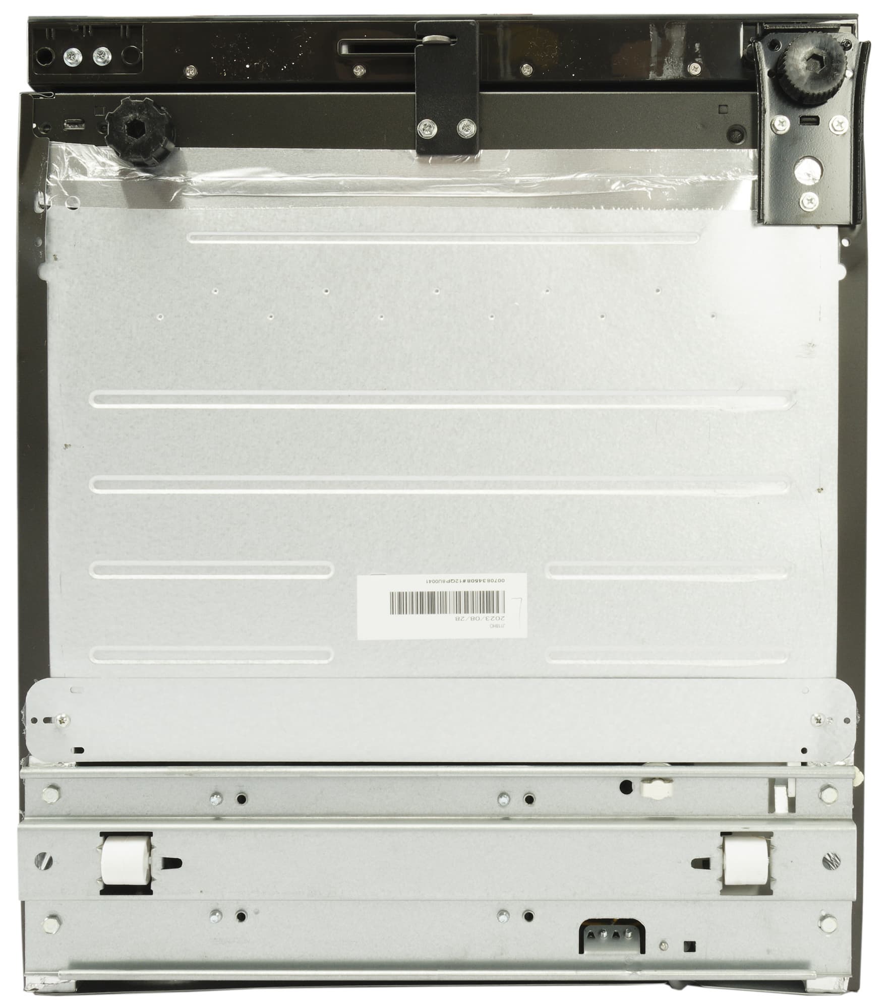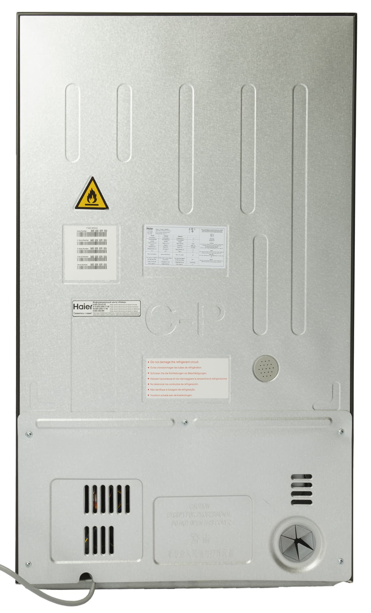 Задняя стенка из неокрашенного металла снабжена вентиляционными отверстиями. На ней производитель разместил шильдик с краткой технической информацией, наклейку с серийными номерами и сведения об используемом в конструкции хладагенте.