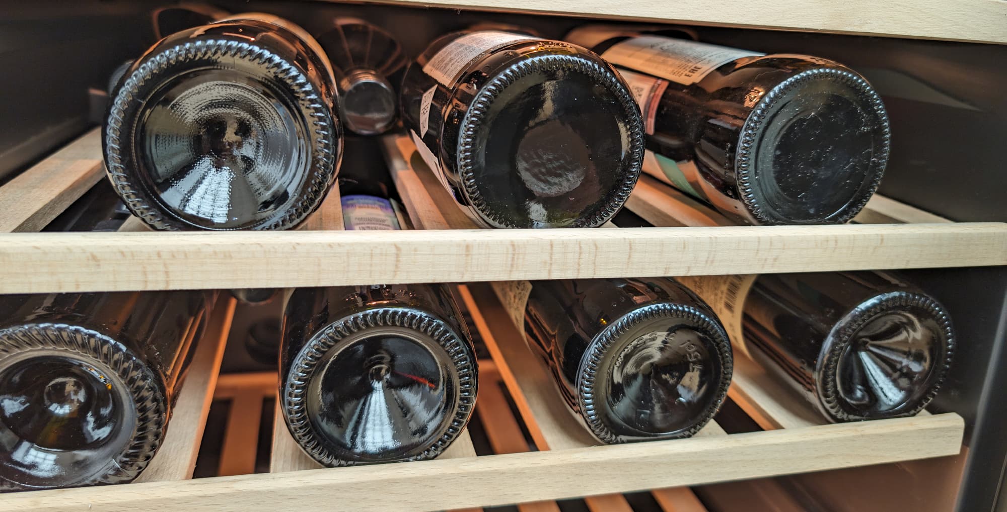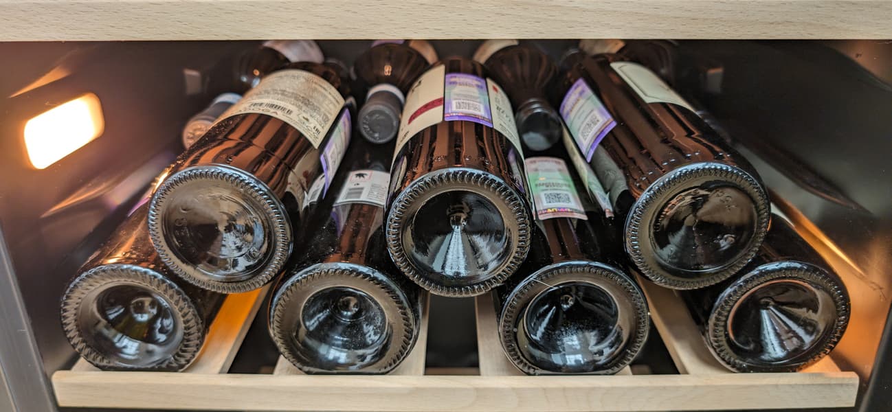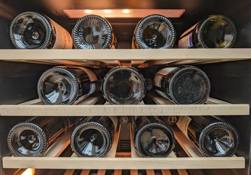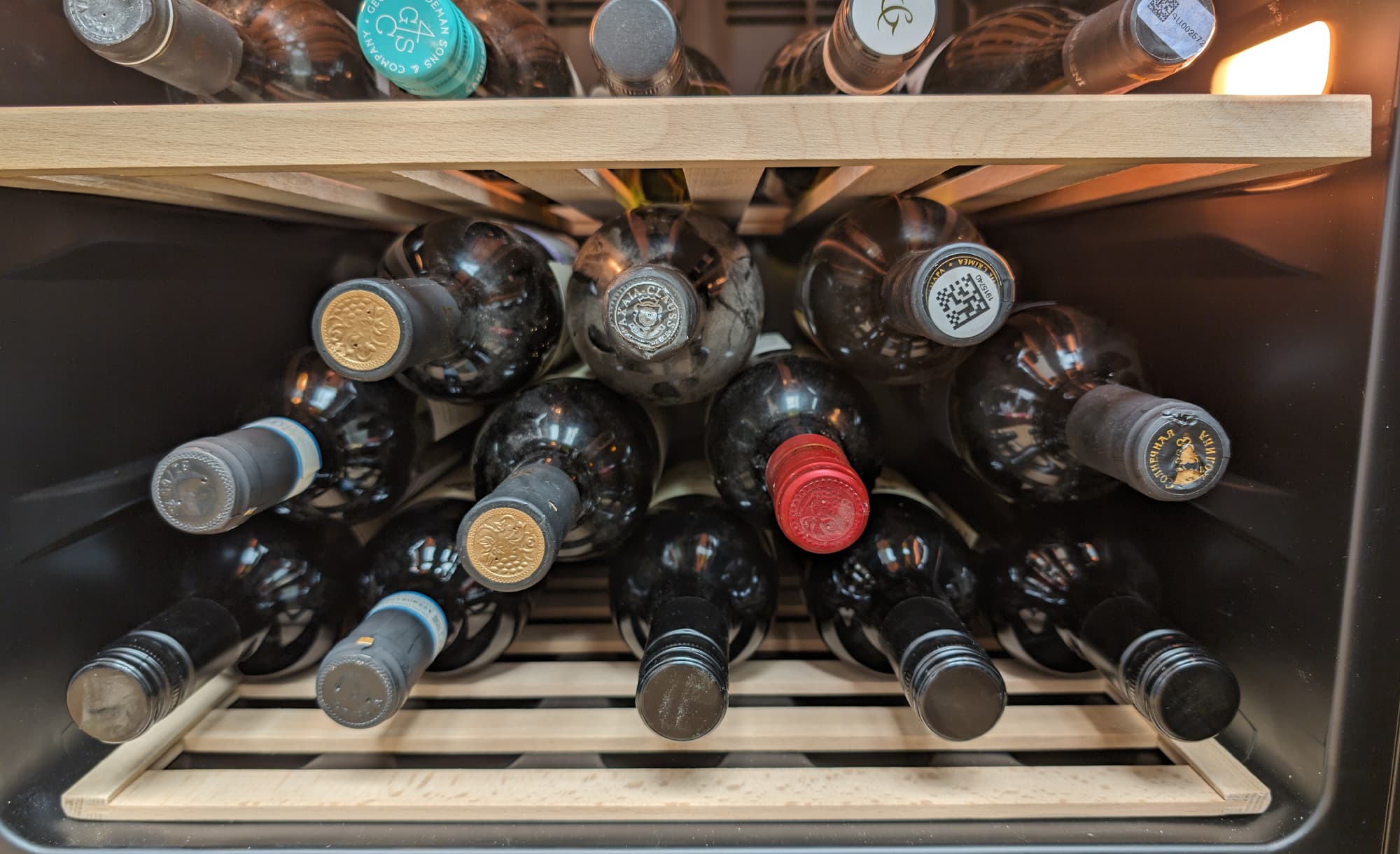 Чтобы оценить возможности этой модели, мы равномерно загрузили ее балластом в виде 15 бутылок вина, разместили внутри камеры пять температурных датчиков (по одному на полку) и включили устройство на максимальное охлаждение (режим «Sparkling» для игристых вин).