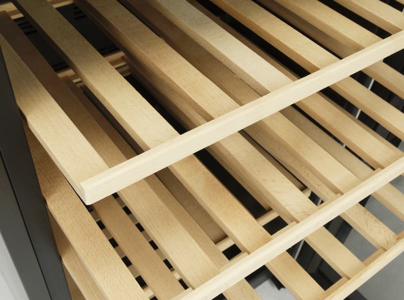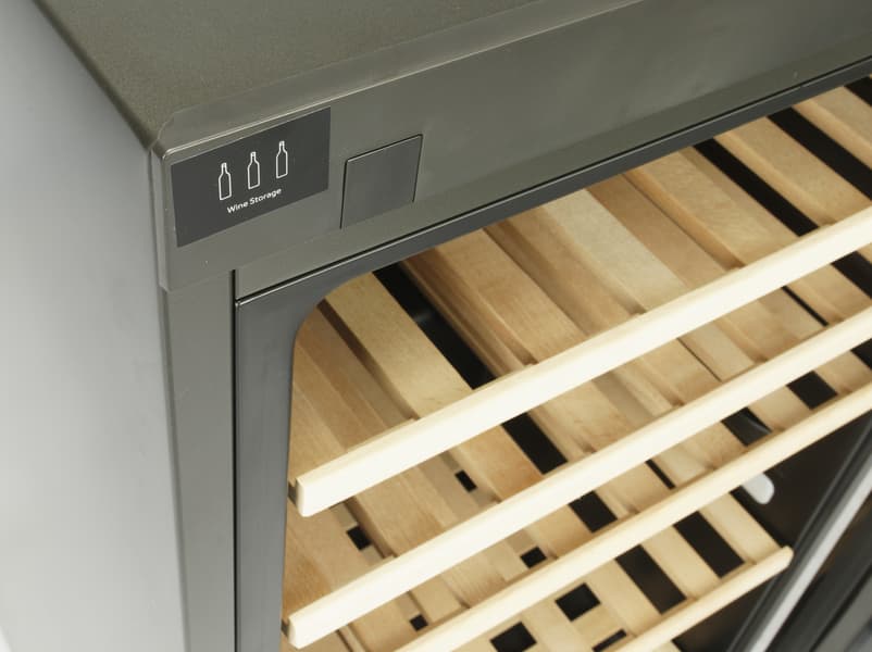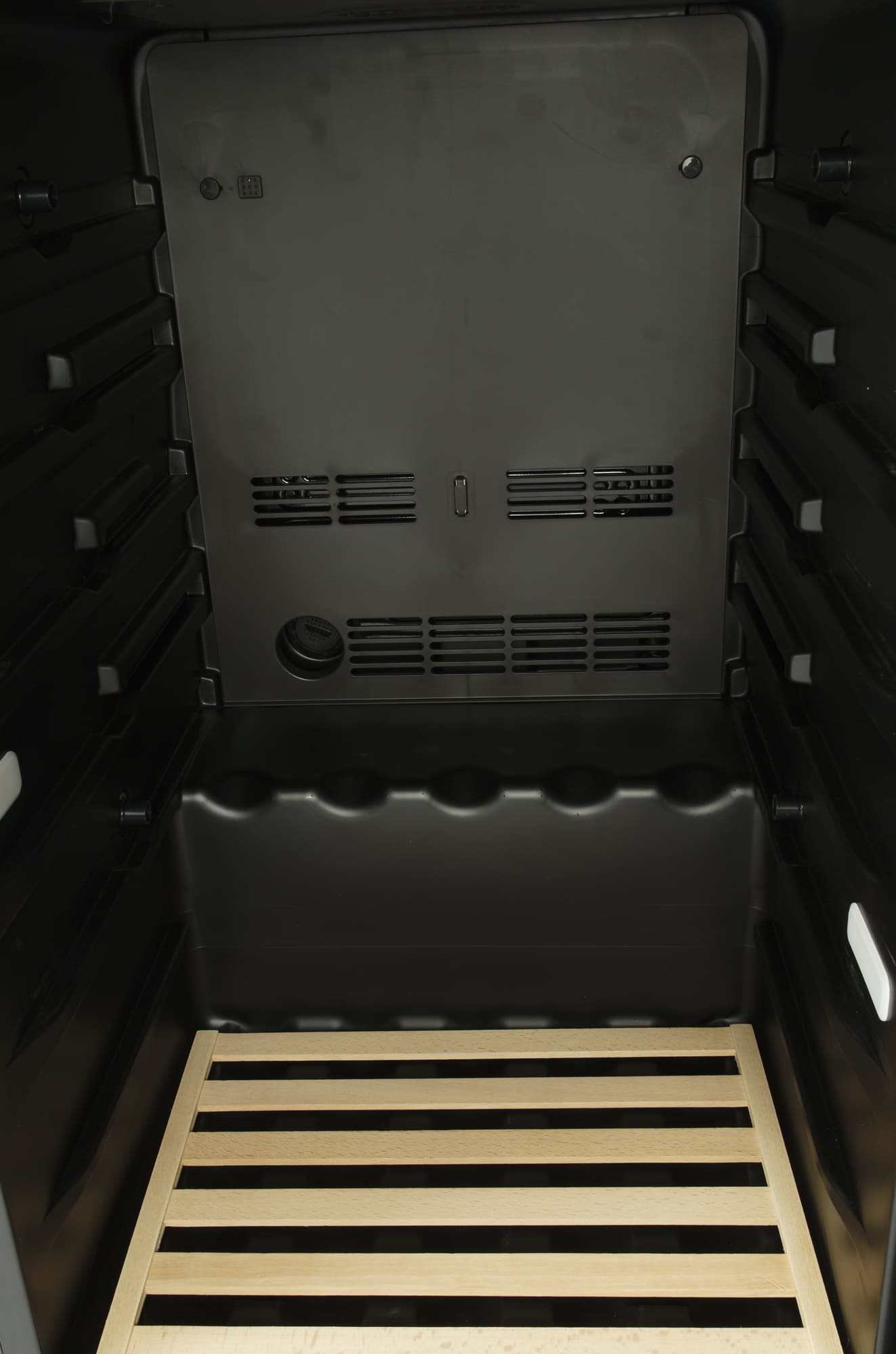 Шкаф рассчитан, разумеется, на горизонтальное хранение бутылок. Их можно разместить на четырех полках из некрашеного букового дерева: на древесине не скапливается конденсат, который может повредить этикетки и испортить пробки.