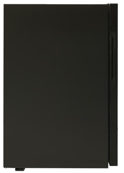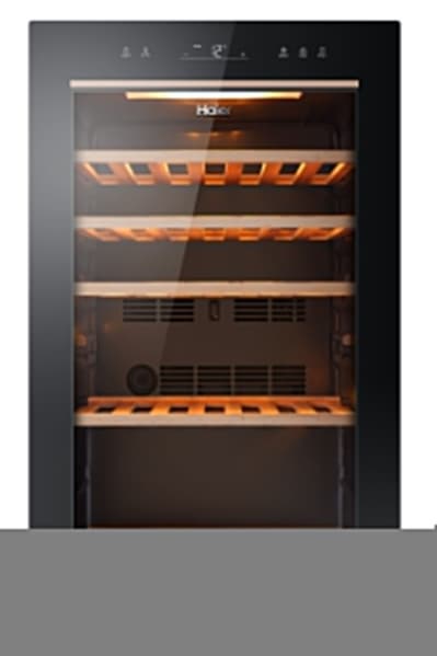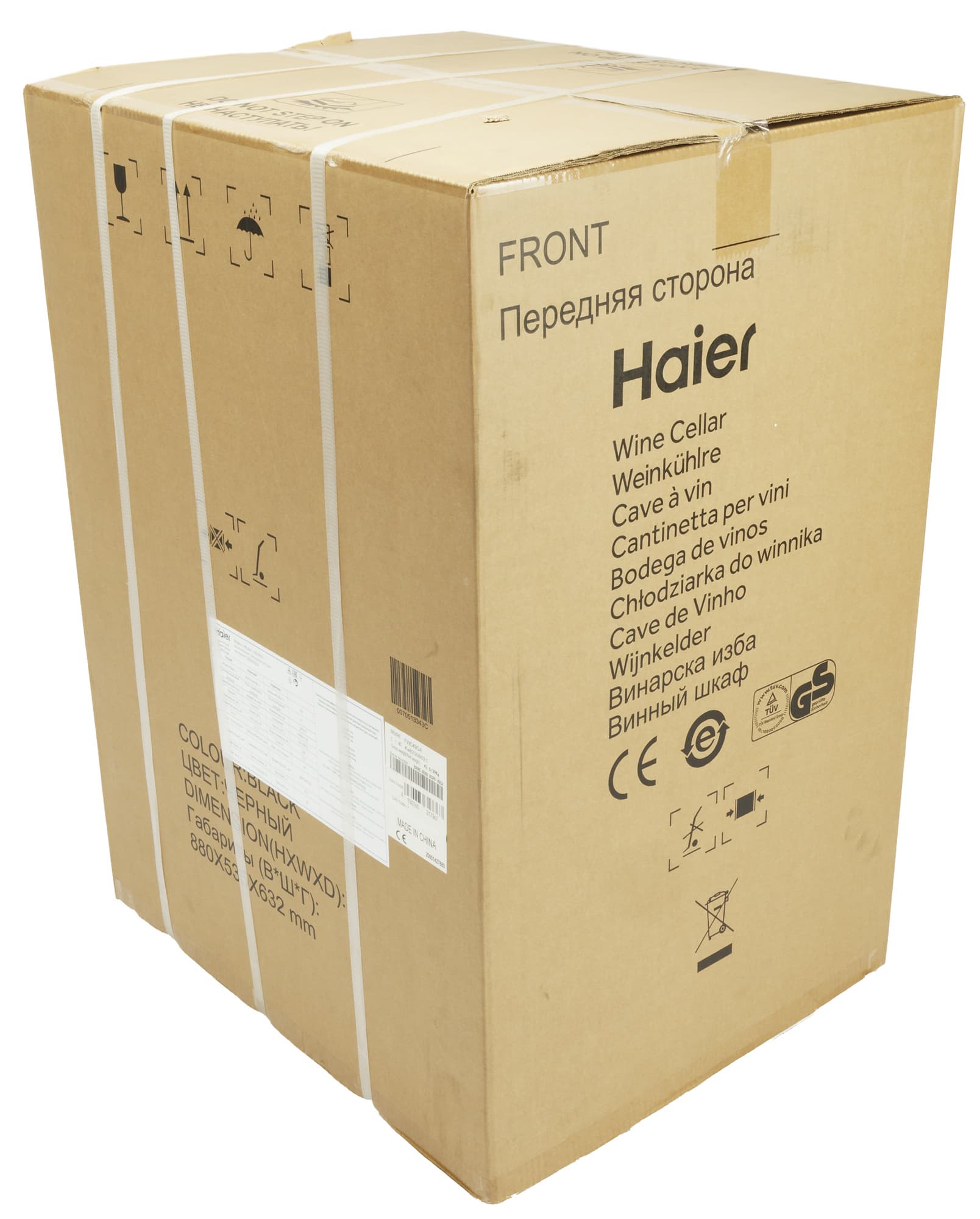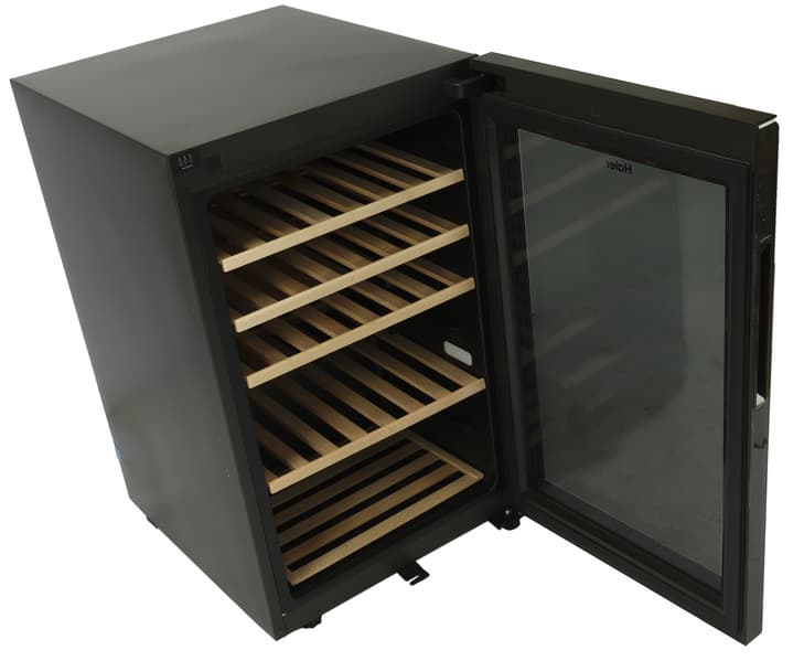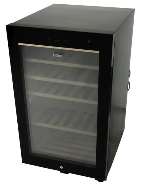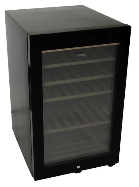У винного шкафа Haier FWC49GA строгий дизайн. В оформлении корпуса и дверцы преобладает черный цвет, настраивающий на серьезный лад.