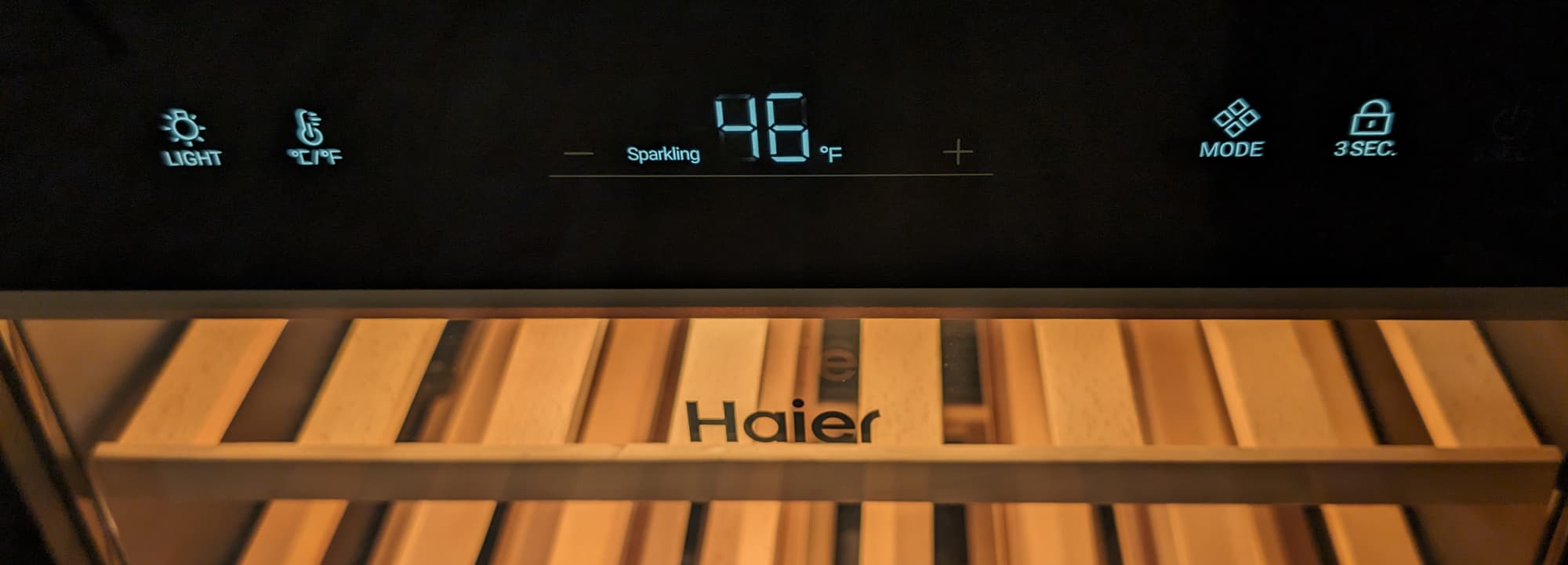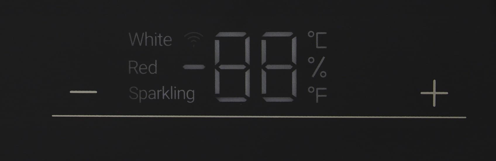 При включении устройства на мгновение зажигаются все доступные символы дисплея. Мы видим здесь символ «%» и значок «Wi-Fi», но у этой модели нет ни беспроводного управления, ни встроенного гигрометра. Вероятно, в конструкции использован типовой дисплей, одинаковый для этой и более продвинутых моделей винных шкафов от Haier.
