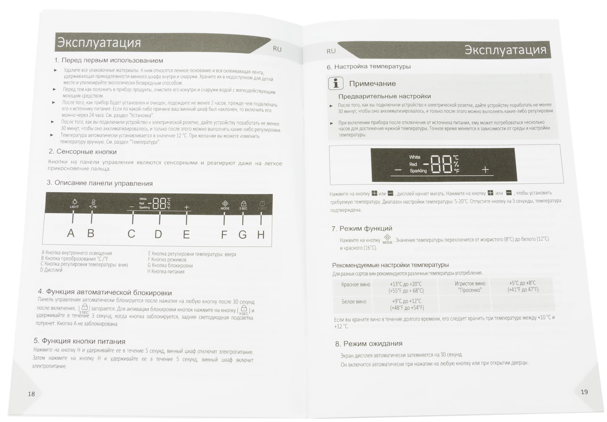 Инструкция составлена на трех языках: русском, казахском и украинском. В ней содержатся подробные сведения о подготовке устройства к работе, управлении винным шкафом и его эксплуатации. Включены также рекомендации по правильному хранению вин разных типов и советы по уходу за прибором.