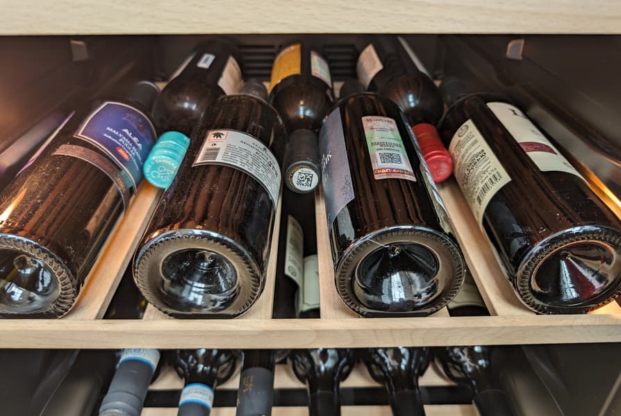 Винный шкаф рассчитан на 49 стандартных бутылок бордо, удобно размещающихся на полках. Можно хранить в нем емкости других типов и размеров, но в таком случае максимальная паспортная вместимость может уменьшиться. Существенный ли это недостаток — решать потребителю.