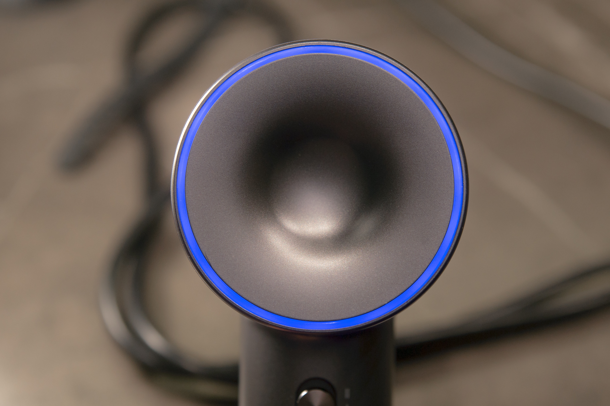 С тыльной стороны по окружности встроено тонкое светодиодное кольцо — это индикатор уровня нагрева, подсвечивающийся во время работы.
