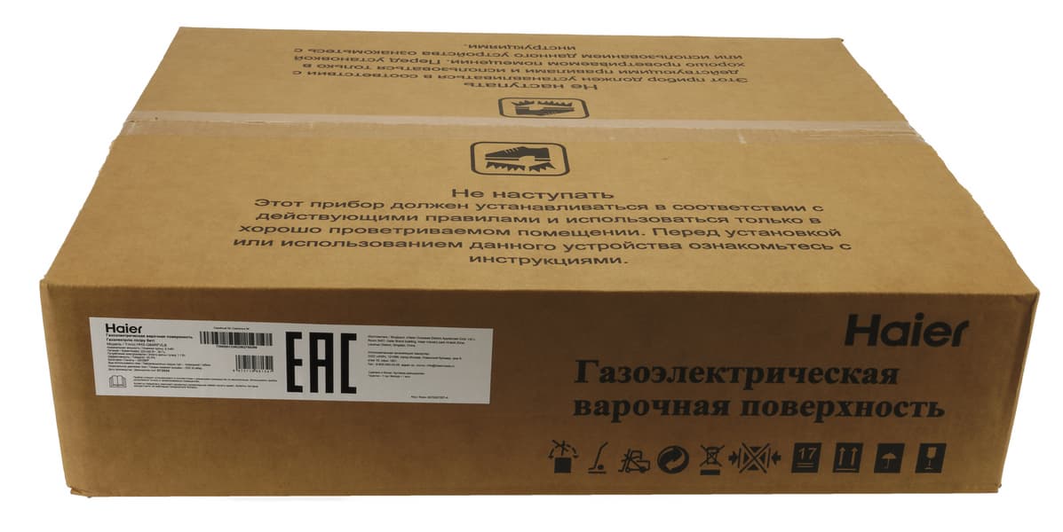 Газовая варочная поверхность Haier HHX-G64RFVLB поставляется в картонной коробке, плотно обтянутой прочным полиэтиленом. На гранях упаковки размещены: логотип компании, краткая информация о модели и ее технические характеристики.