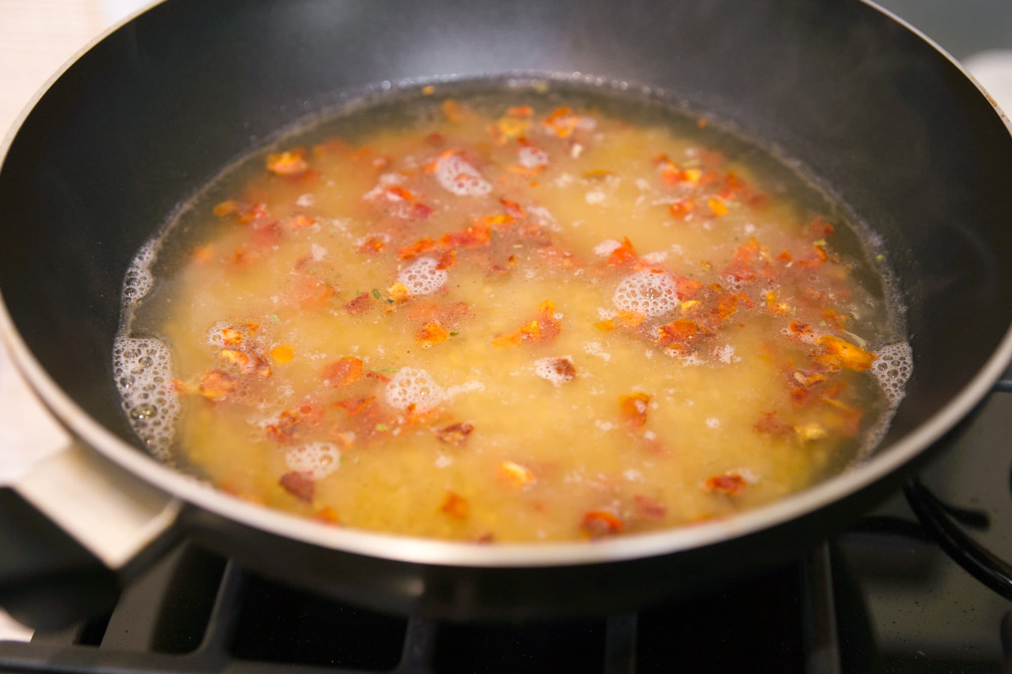 Большая конфорка работала на 7-м уровне мощности. Потом влили немного горячей воды так, чтобы она покрывала дно, уменьшили пламя до 2 и накрыли сковородку крышкой. Через несколько минут убрали крышку, увеличили огонь до 6 и дали воде выпариться.
