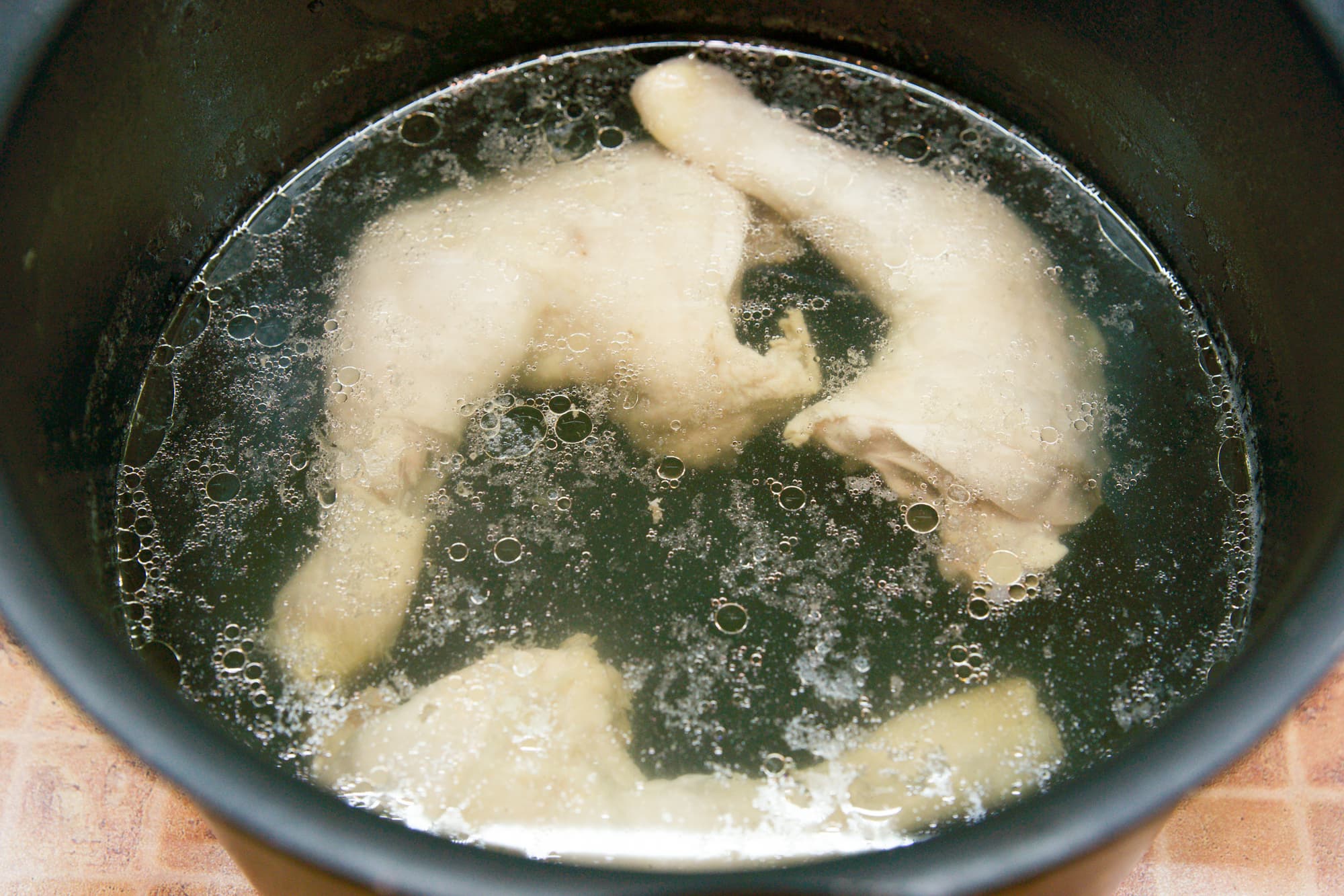 3 куриных окорочка залили водой, добавили луковицу, черный перец горошком, посолили и поставили на самую мощную конфорку. После закипания сняли пену и уменьшили огонь с 9 до 1. Температура жидкости опустилась до 100 °C и остановилась. Нам требовалась цифра ниже, поэтому кастрюля была переставлена на среднюю конфорку. 1-я мощность этой горелки смогла обеспечить стабильные 92 °C. Для сравнения, на маленькой вспомогательной конфорке температура бульона на 1-й мощности составила 86 °C, а на 9-й — 90 °C.