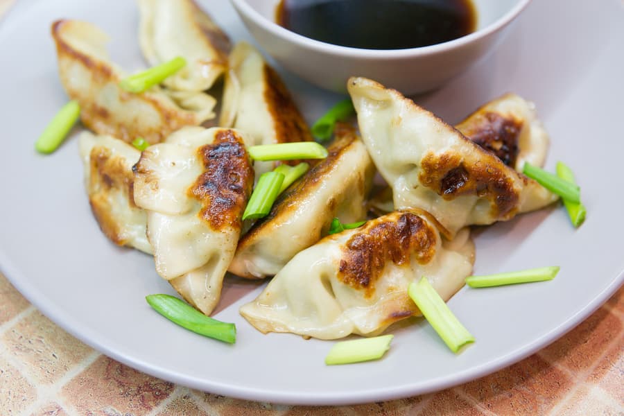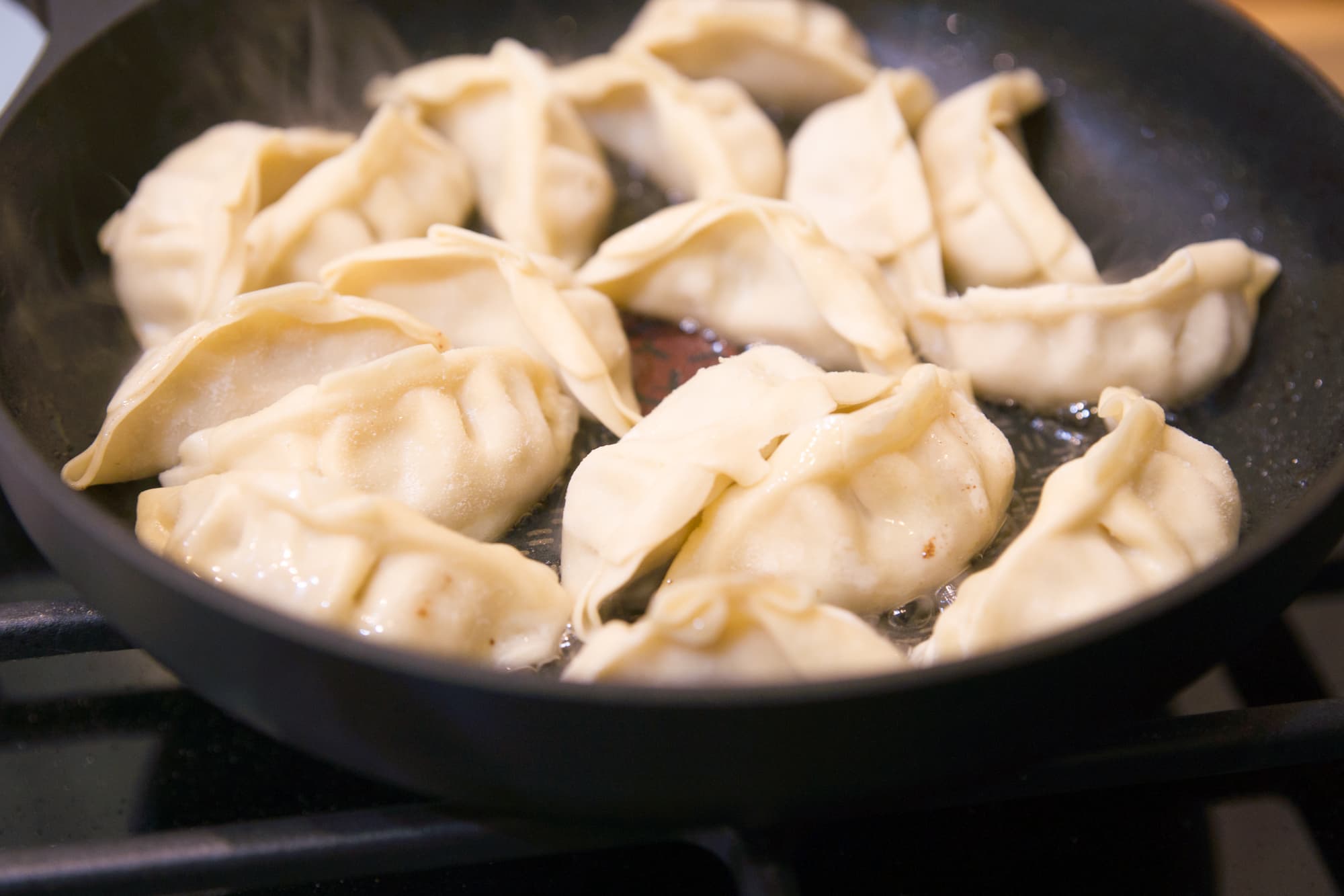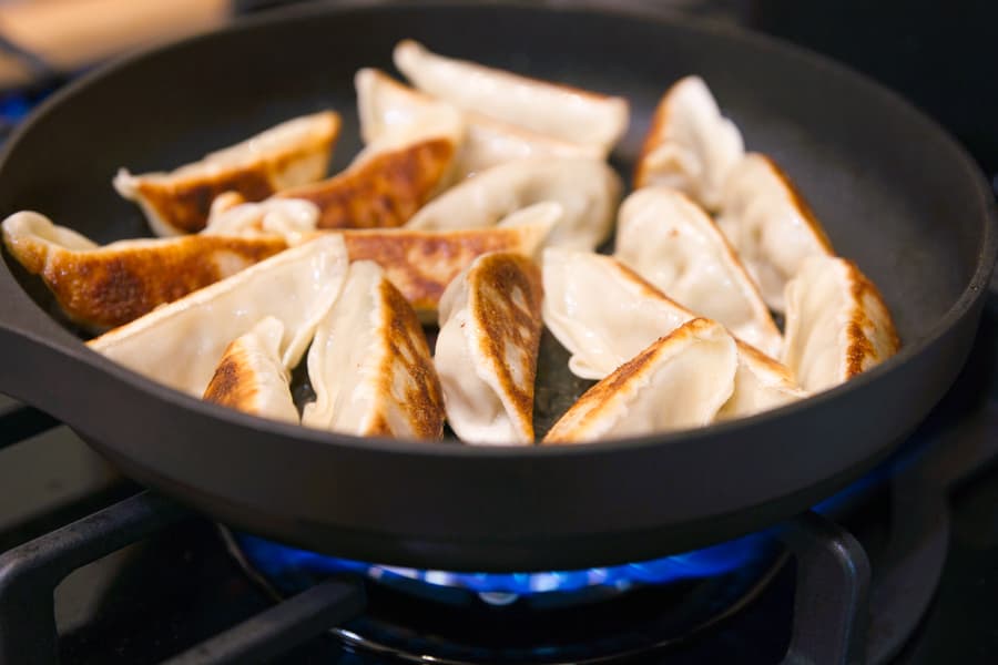 На разогретую сковородку выложили замороженные гёдза и, периодически помешивая, обжарили их до появления аппетитной корочки.
