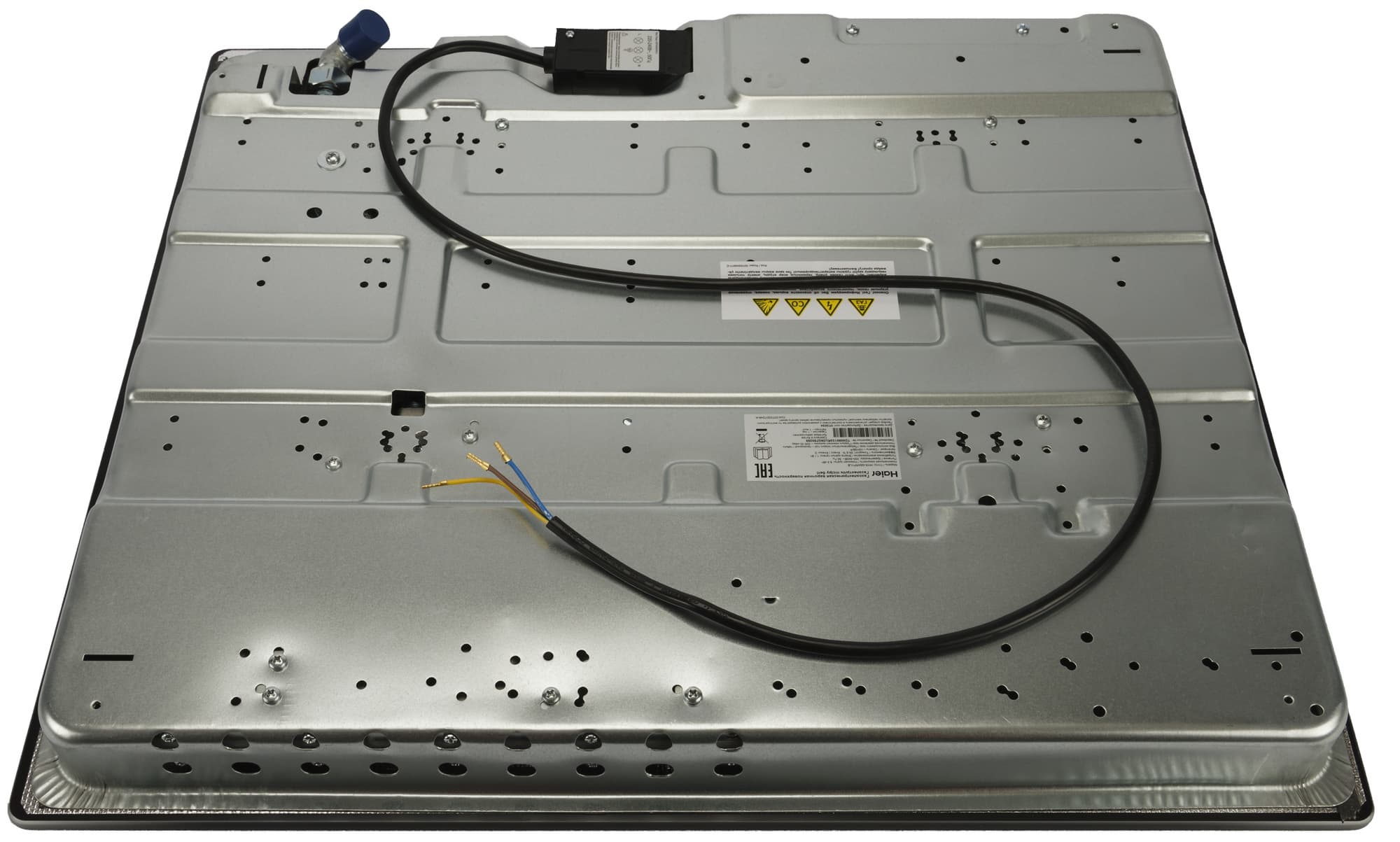 На дне панели мы также видим вентиляционные отверстия, наклейку с технической информацией и сетевой кабель. Он не укомплектован вилкой, так как плита рассчитана на встраивание и постоянное подключение к электросети. Если подключение планируется через розетку, вилку придется монтировать самостоятельно.
