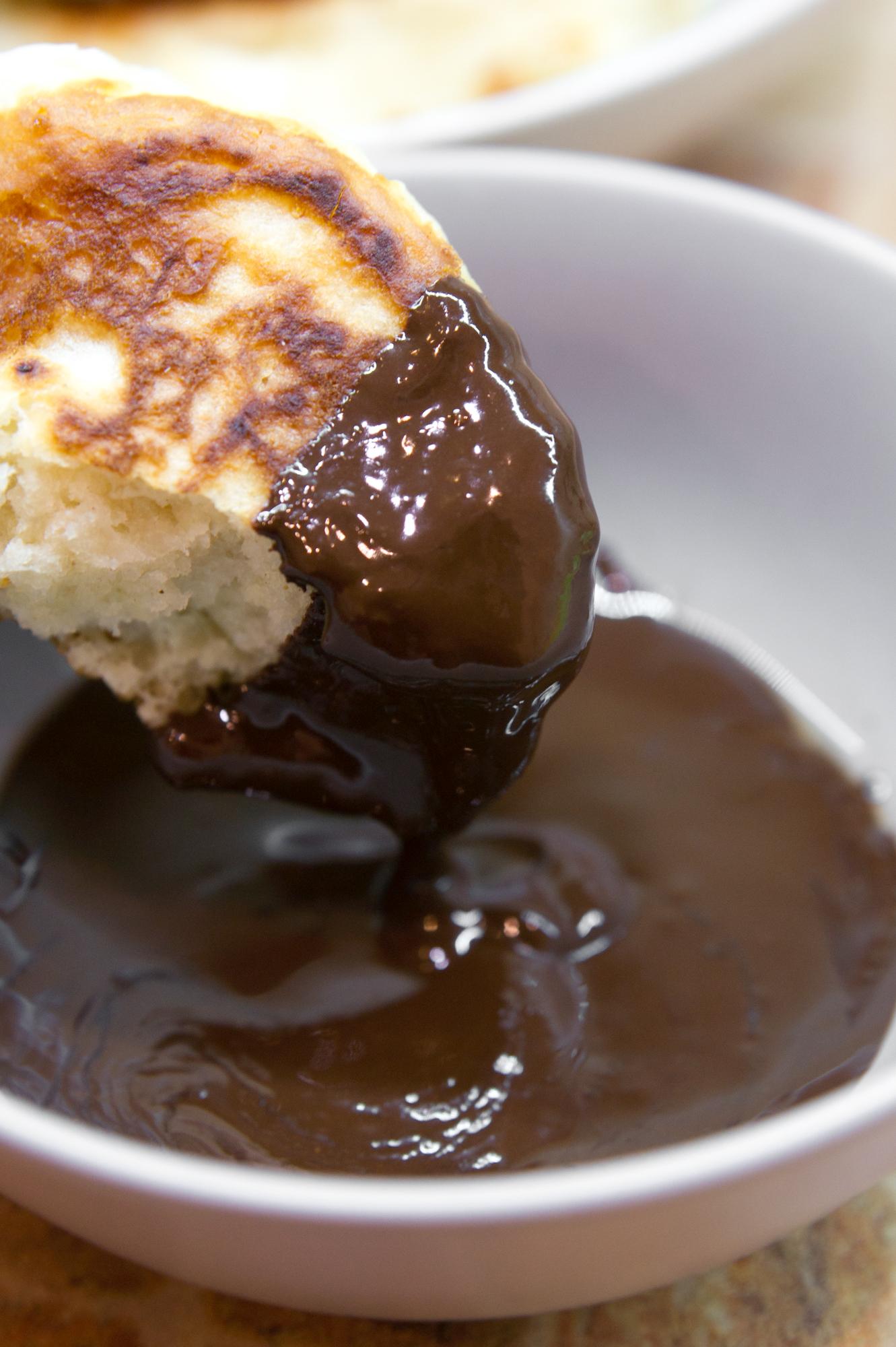 Одновременно с оладьями на свободной средней конфорке установили глубокую сковородку, налили в нее до половины воду, в центр поставили пиалу с поломанной на крупные куски половиной плитки шоколада и выставили 4-ю мощность. Когда третья порция оладий дожарилась, шоколад уже был растоплен.