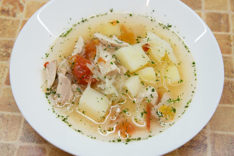 Примерно через час достали окорочка, закинули в бульон нарезанный на кубики картофель и увеличили мощность конфорки до 6. Минут через 15, когда картофель уже почти сварился, добавили к нему крупно нарубленные помидоры и нашинкованную свежую капусту, закрыли кастрюлю крышкой и уменьшили огонь до 3. Еще через 15 минут выключили газ и, не открывая крышки, оставили суп настаиваться. Так ароматный, прозрачный бульон превратился в сытные и вкусные щи.