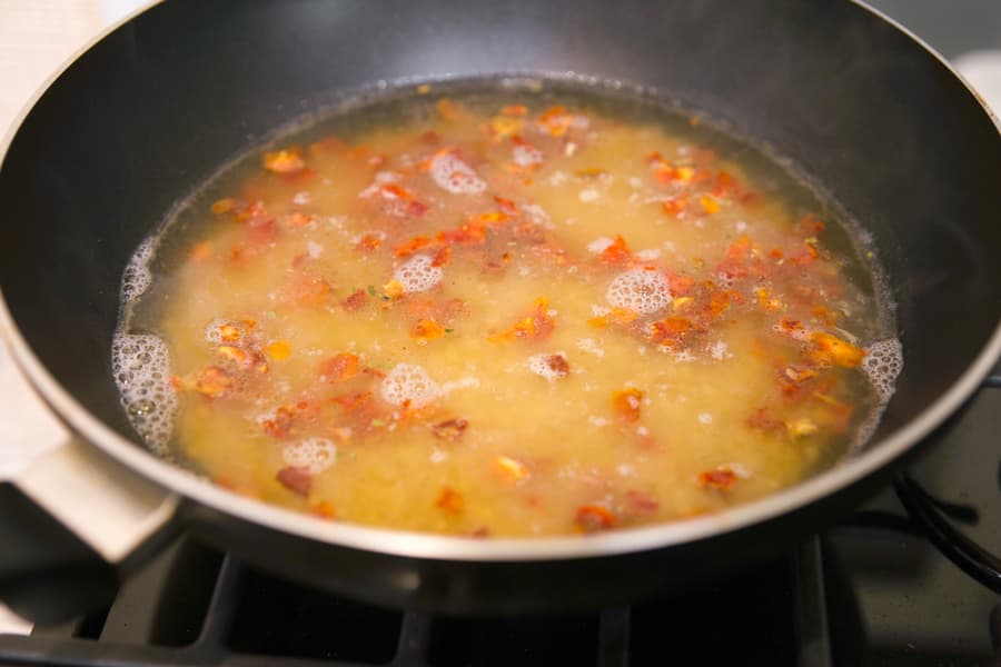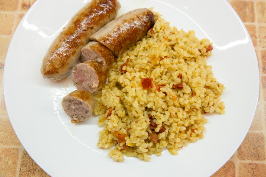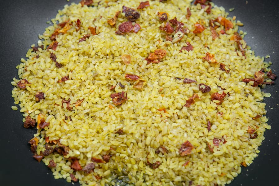 В этом тесте мы готовили на двух конфорках сразу. В крупной глубокой сковороде на средней конфорке быстро обжарили булгур с сушеными томатами, специями и незначительным количеством растительного масла.