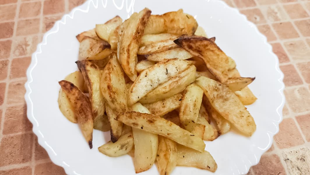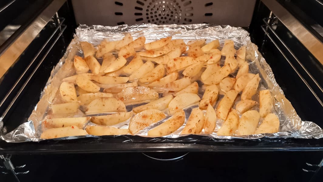 Дольки сырого картофеля, обмазанные солью и специями с небольшим количеством масла, поджаривались в режиме Аэрогриль при температуре 200 °C ровно 20 минут.