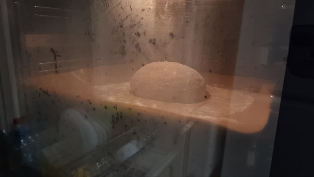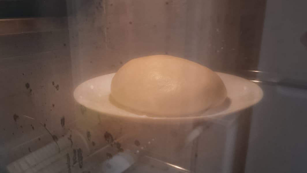 Для пирога мы взяли два шарика замороженного дрожжевого теста, по 0,5 кг каждый. После разморозки при комнатной температуре каждый колобок по очереди был отправлен в камеру на расстойку с паром в течение 20 минут.