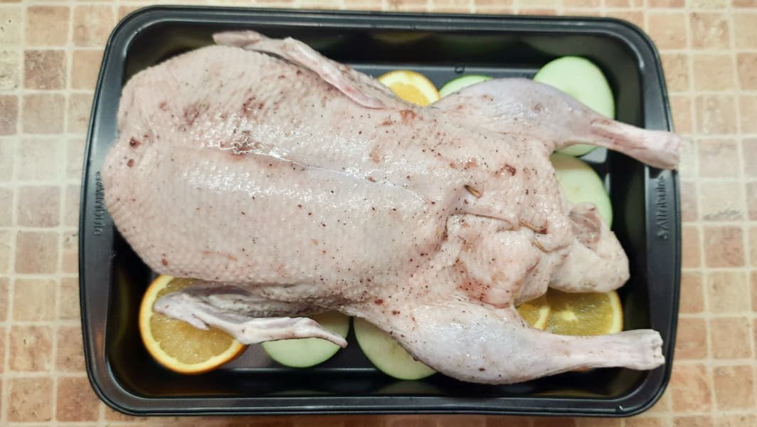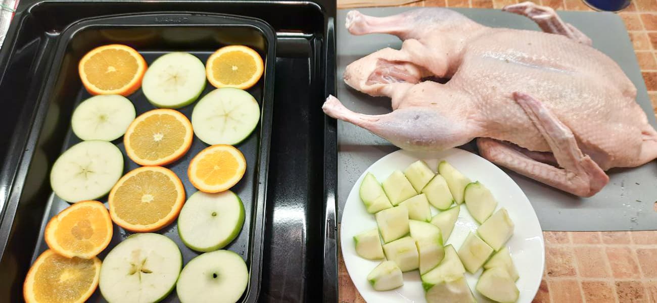 Тушку весом 2 кг снаружи и внутри натерли смесью соли и специй. Сверху обмазали брусничным соусом, начинили нарезанными на кубики зелеными яблоками. На поддон выложили дольки апельсина и яблок, сверху уложили птицу.