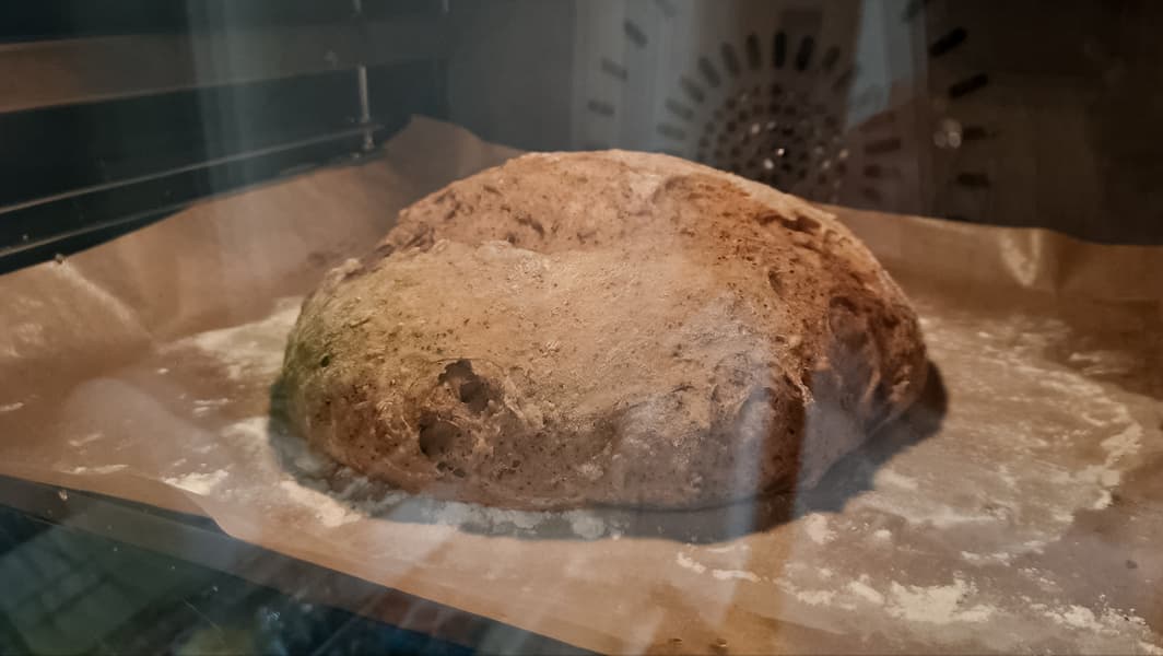 Раз есть авторежим для выпечки хлеба, грех им не воспользоваться. Замешали тесто из цельнозерновой и пшеничной муки с семенами и пшеничными отрубями и отправили в камеру для первой расстойки. Расстойка с паром длилась 50 минут (время мы выставили на свое усмотрение). Тесто подросло, стало очень воздушным, мы аккуратно обмяли его со всех сторон, сформировали будущую буханку, выложили на присыпанную мукой бумагу и вернули в камеру. В парогенератор добавили воды и включили авторежим выпечки хлеба.