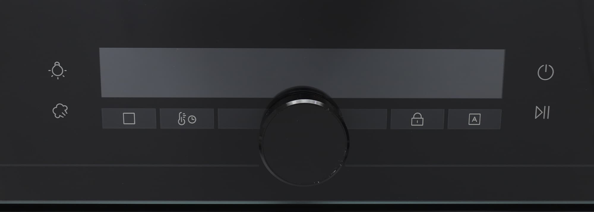 Панель управления Haier HOQ-F6CASGB состоит из дисплея, сенсорных кнопок вокруг него и круглого поворотно-нажимного переключателя (ручки) посередине.