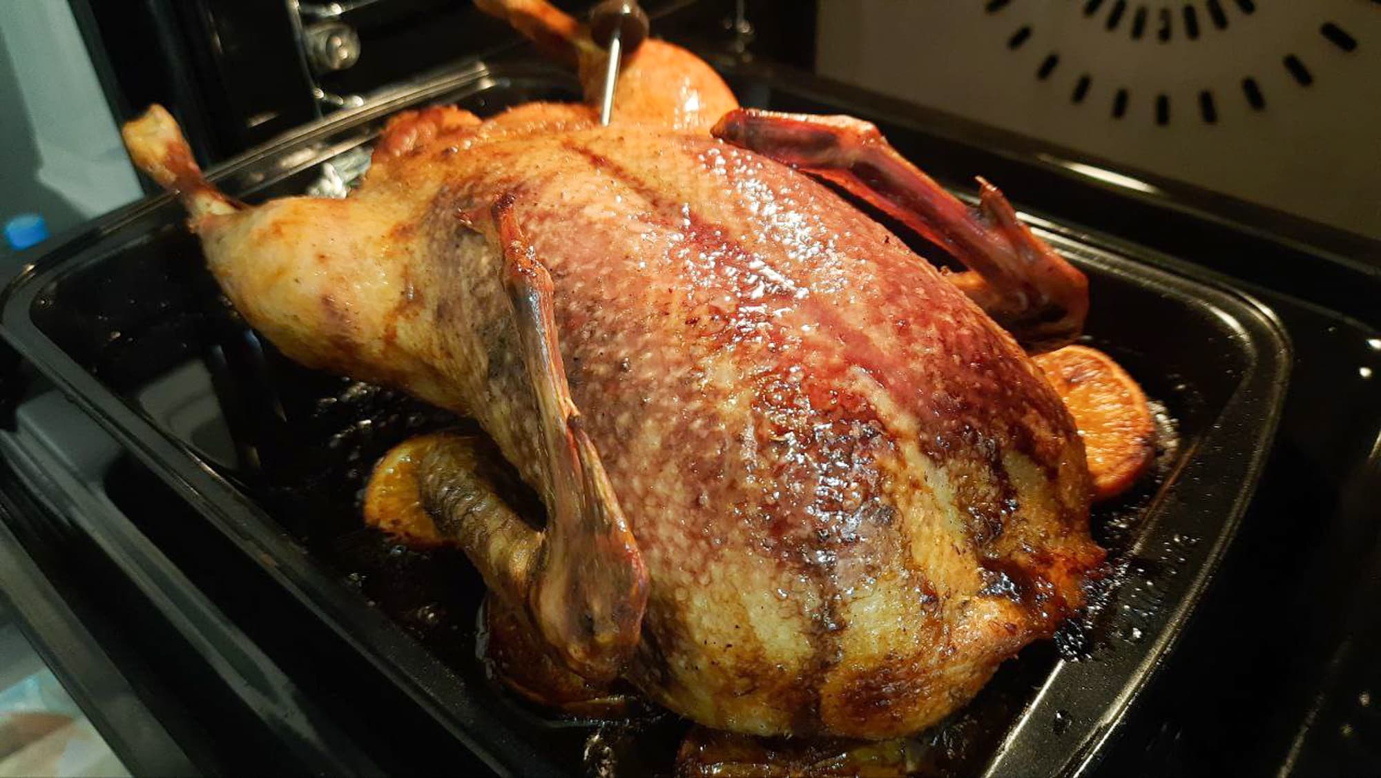 Разогрели духовку до 190 °C в режиме верхнего и нижнего нагрева с конвекцией, поставили противень в камеру и воткнули в тушку термощуп, установив предел в 75 °C. Первые 1,5 часа утка запекалась под фольгой. Дальше мы сняли фольгу, выдвинули противень, облили тушку вытопившимся жиром и примерно за 15 минут до окончания поменяли режим на Гриль максимальной мощности. В последние 5 минут перевернули, чтобы получить корочку со всех сторон.