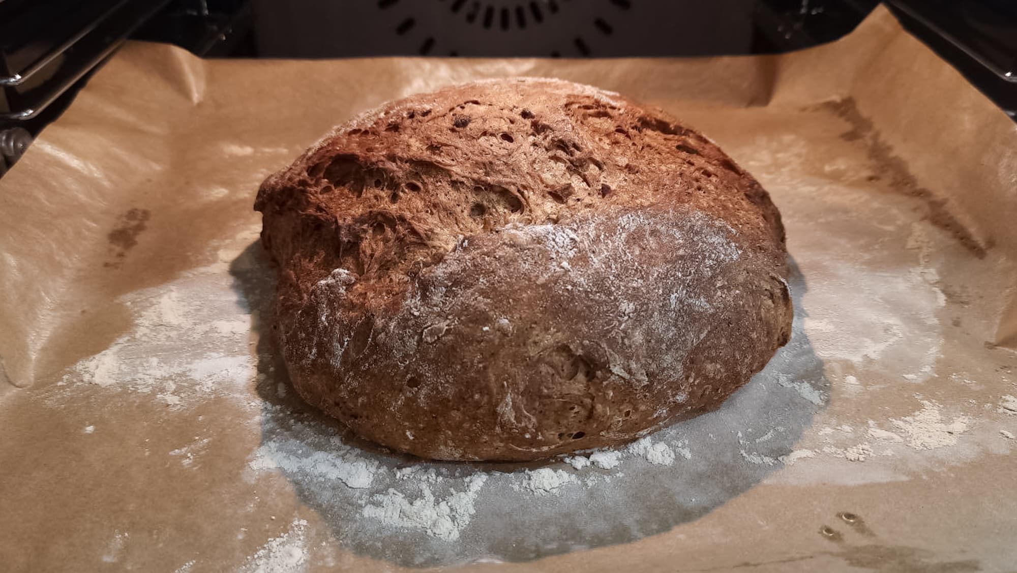 По окончании приоткрыли дверцу и дали хлебу остыть в течение 15 минут. Корочка показалась нам излишне твердой, поэтому доходил хлеб уже на столе, обернутым в полотенце. Корочка стала мягче, тончайший ее слой похрустывал ровно так, как и планировалось.