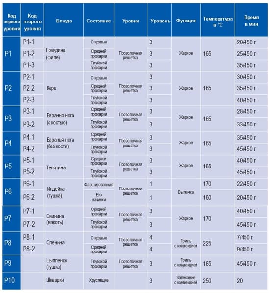 Набор авторежимов для запекания различных видов мяса и птицы имеет 10 уровней с подпунктами в зависимости от желаемой степени прожарки. Настройки всех режимов рассчитаны на определенный вес блюда — 450 г. Соответственно, если мясо, отправляемое в духовку, весит в несколько раз больше, по окончании цикла придется запустить режим снова и возможно не единожды. Так что для больших порций лучше использовать термощуп, которые обеспечит гарантию непрерывного приготовления до готовности.