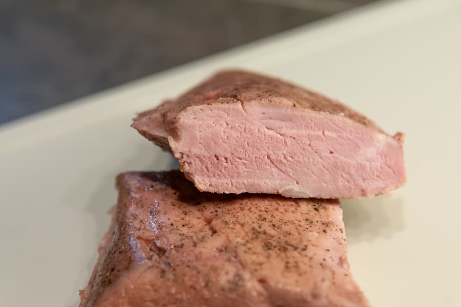Свиную вырезку поделили на 4 части, натерли солью с черным молотым перцем и вакуумировали в 3 пакета.