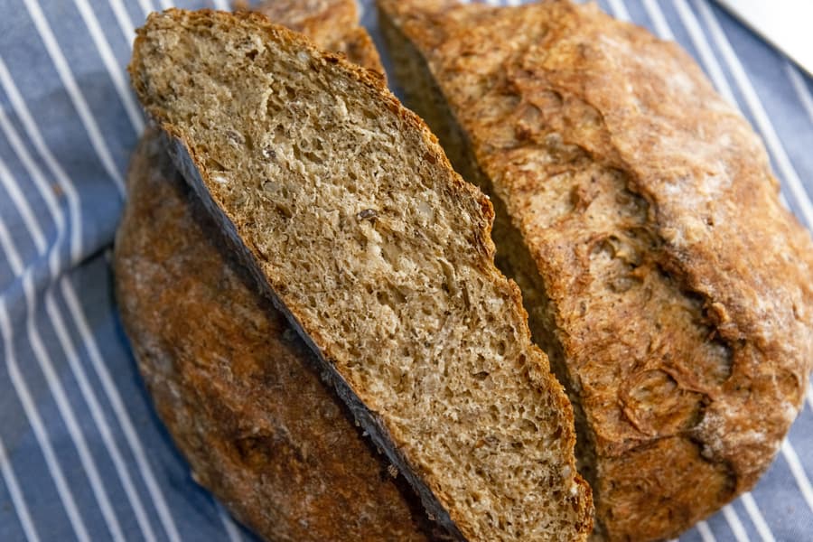Внутри среднепористый мякиш получился полностью пропеченным, мягким и не слишком плотным. Верх, низ и края буханки зарумянились одинаково хорошо.