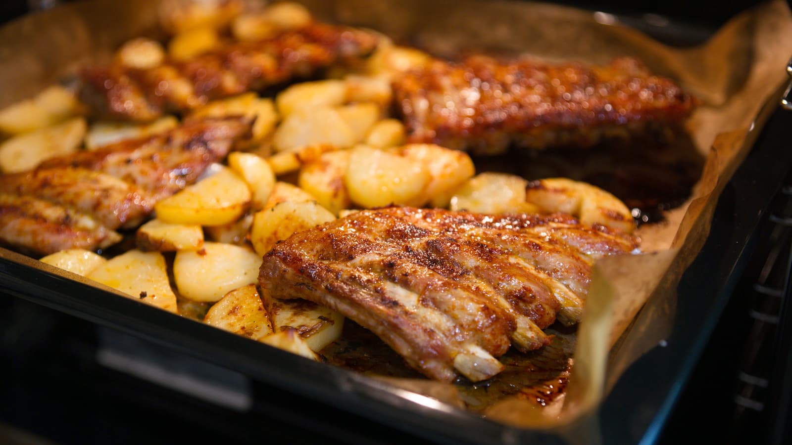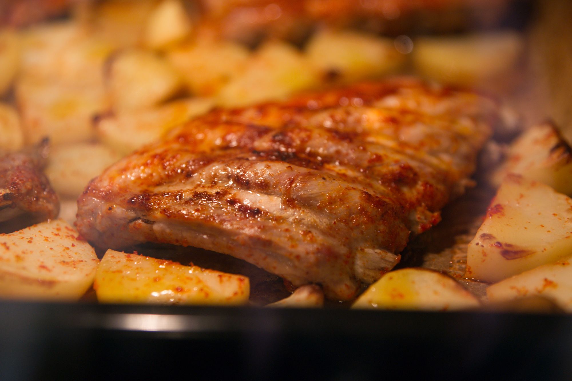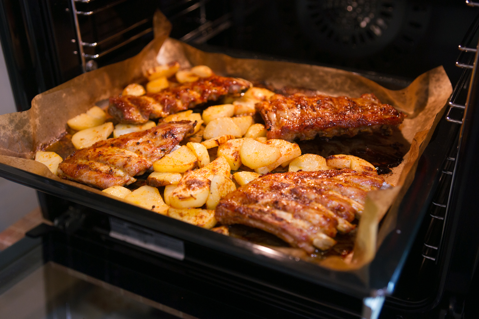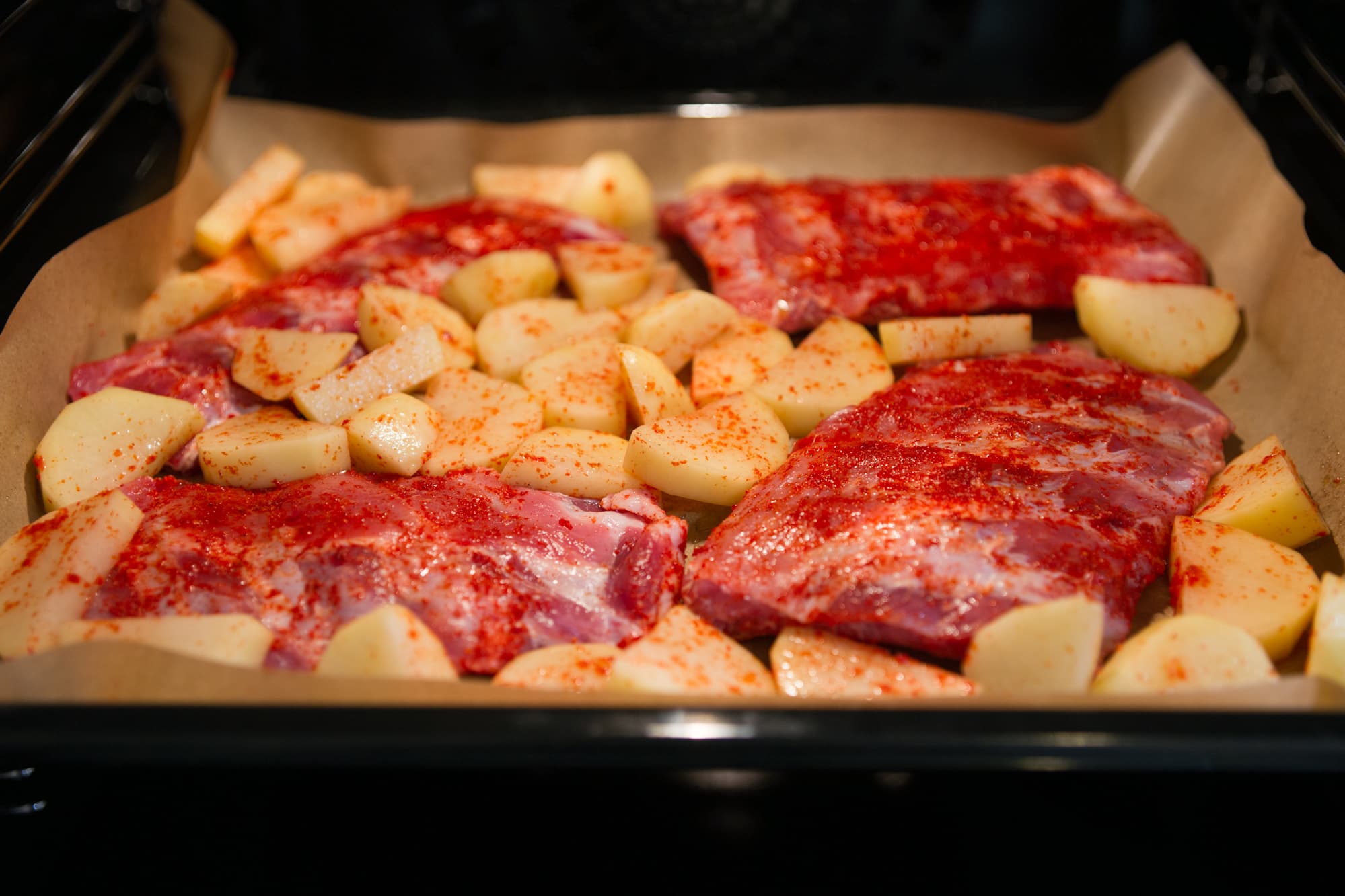 Противень с картофелем и свиными ребрами, натертыми солью и паприкой, поместили в духовку, разогретую до 200 °C.