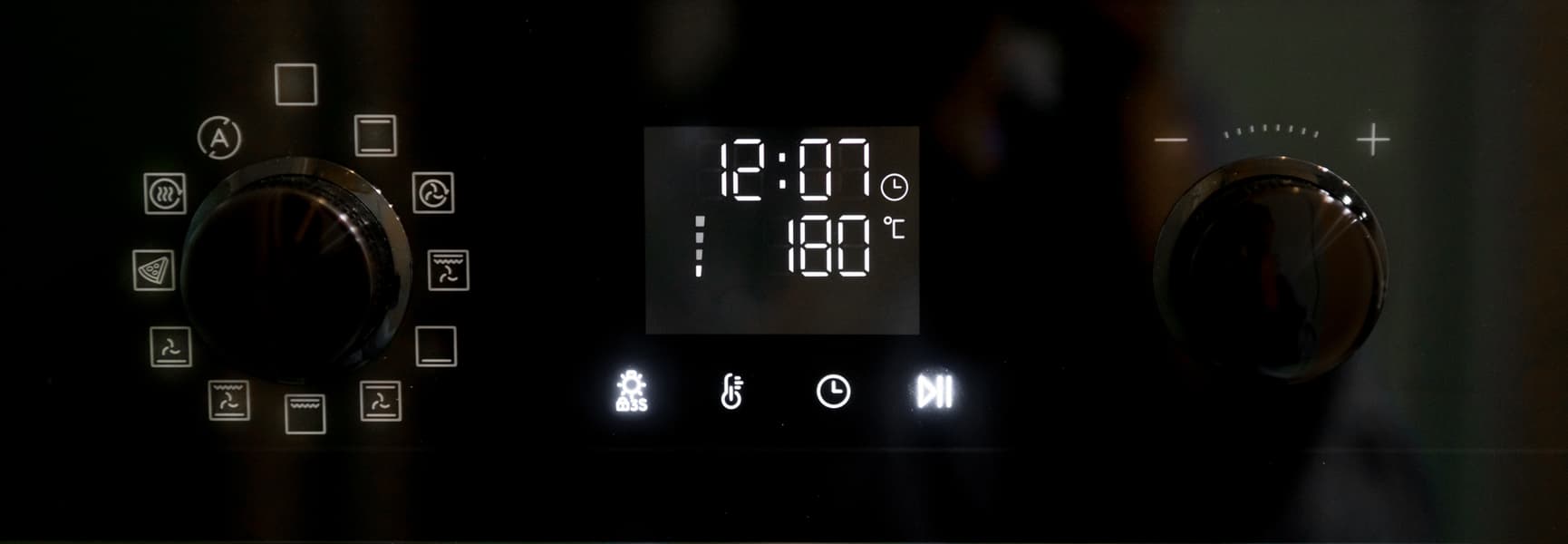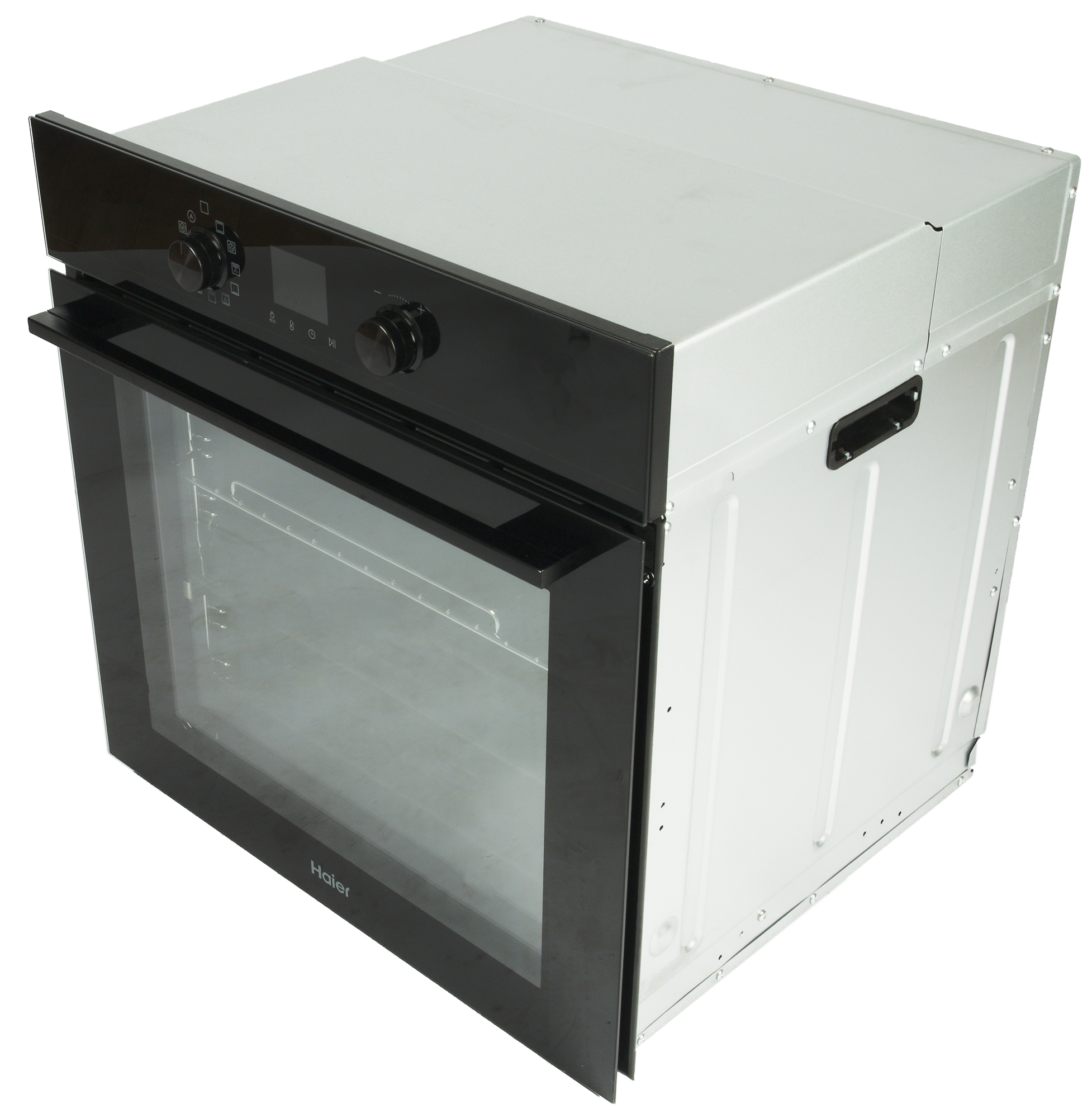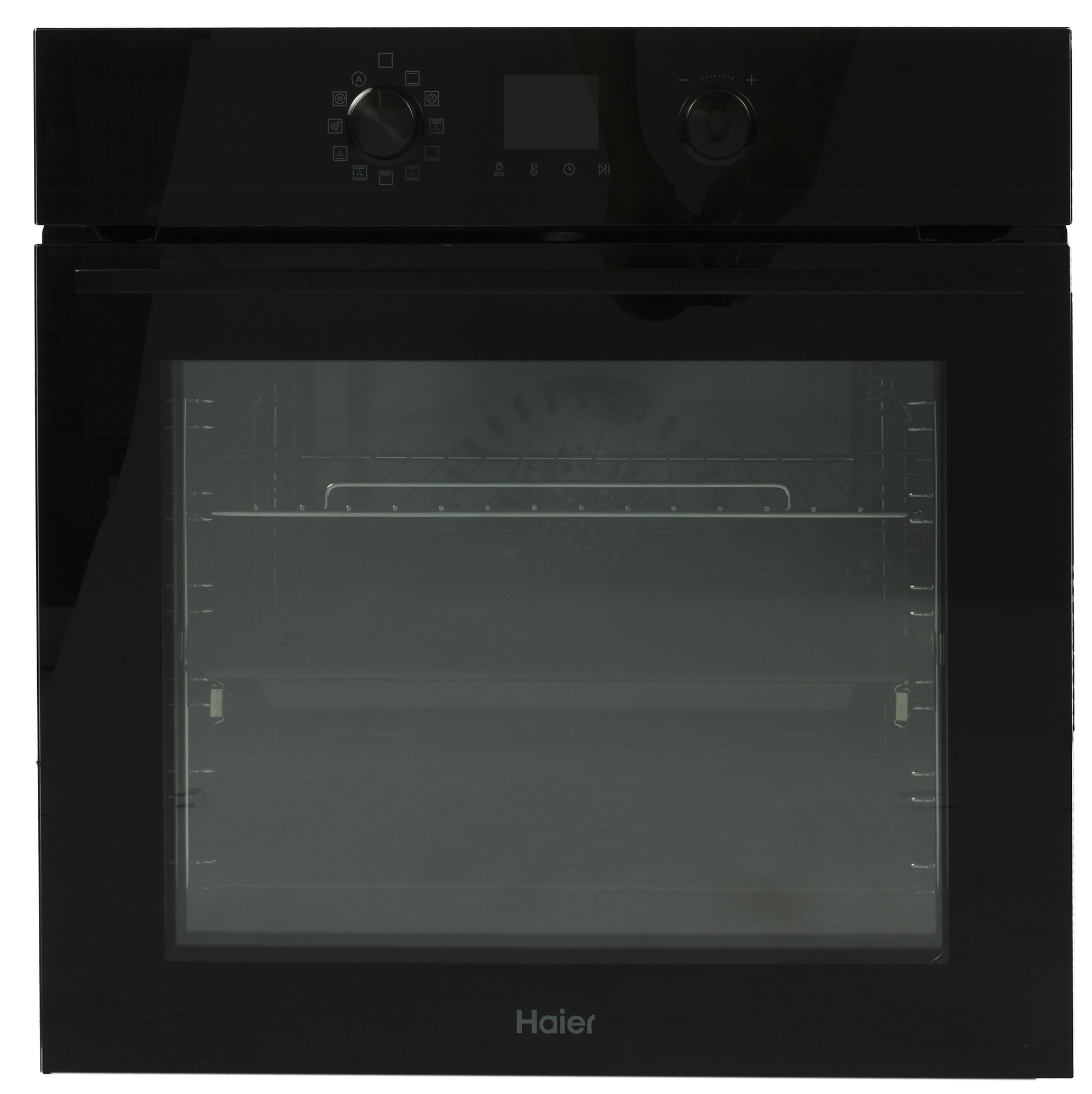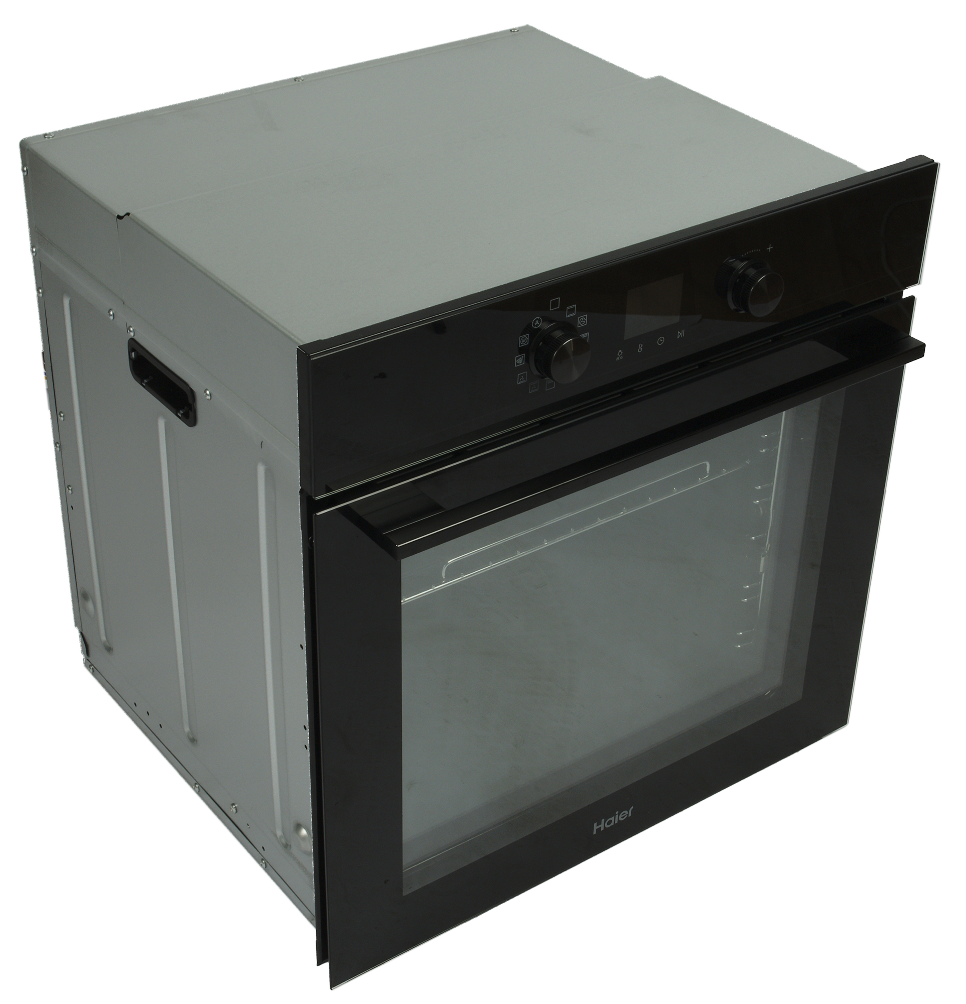 Панель управления Haier HOQ-K4AAN3GB состоит из дисплея, сенсорных кнопок под ним и пары круглых утапливаемых переключателей по бокам.