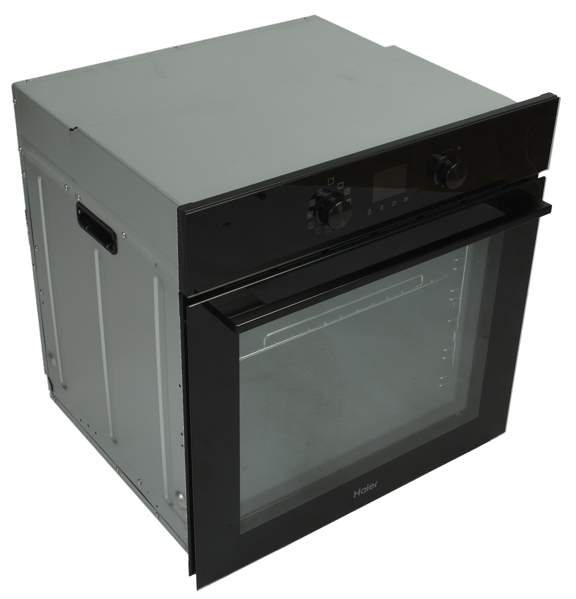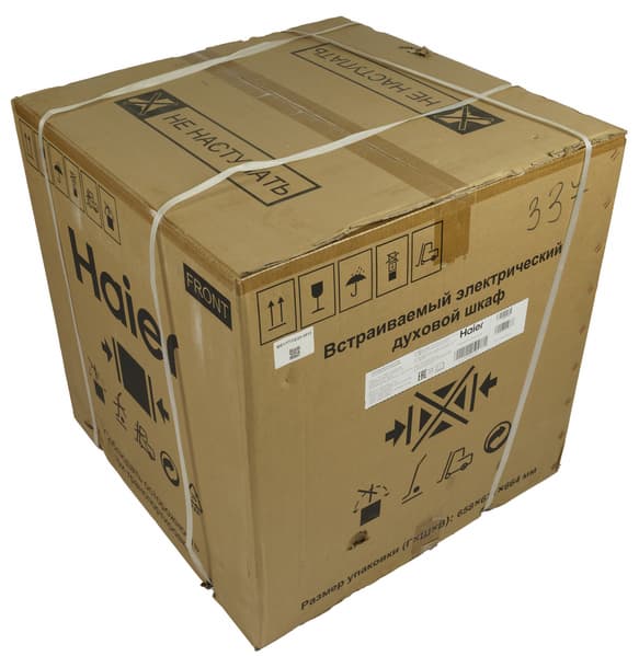 Духовой шкаф Haier HOQ-K4AAN3GB приехал к нам на тестирование в коробке из простого коричневого картона, дополнительно стянутой пластиковой лентой.