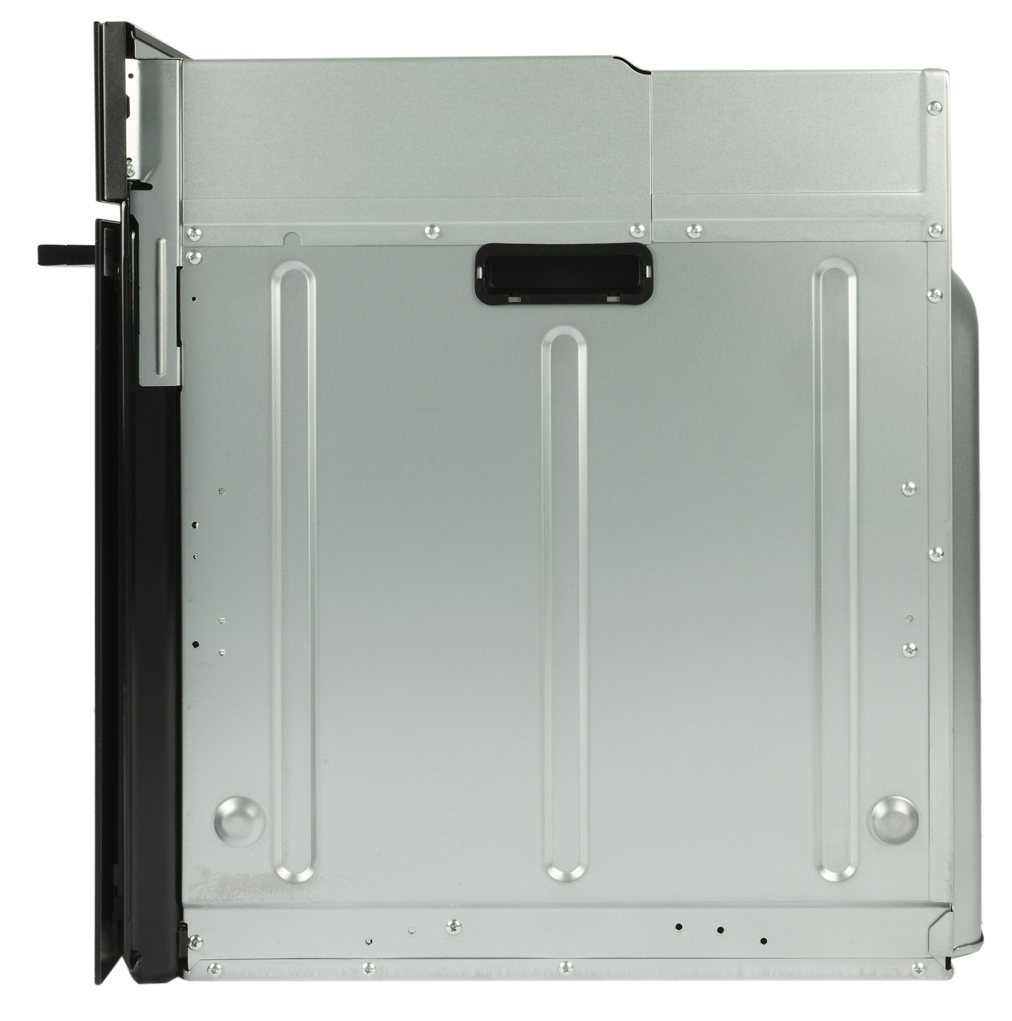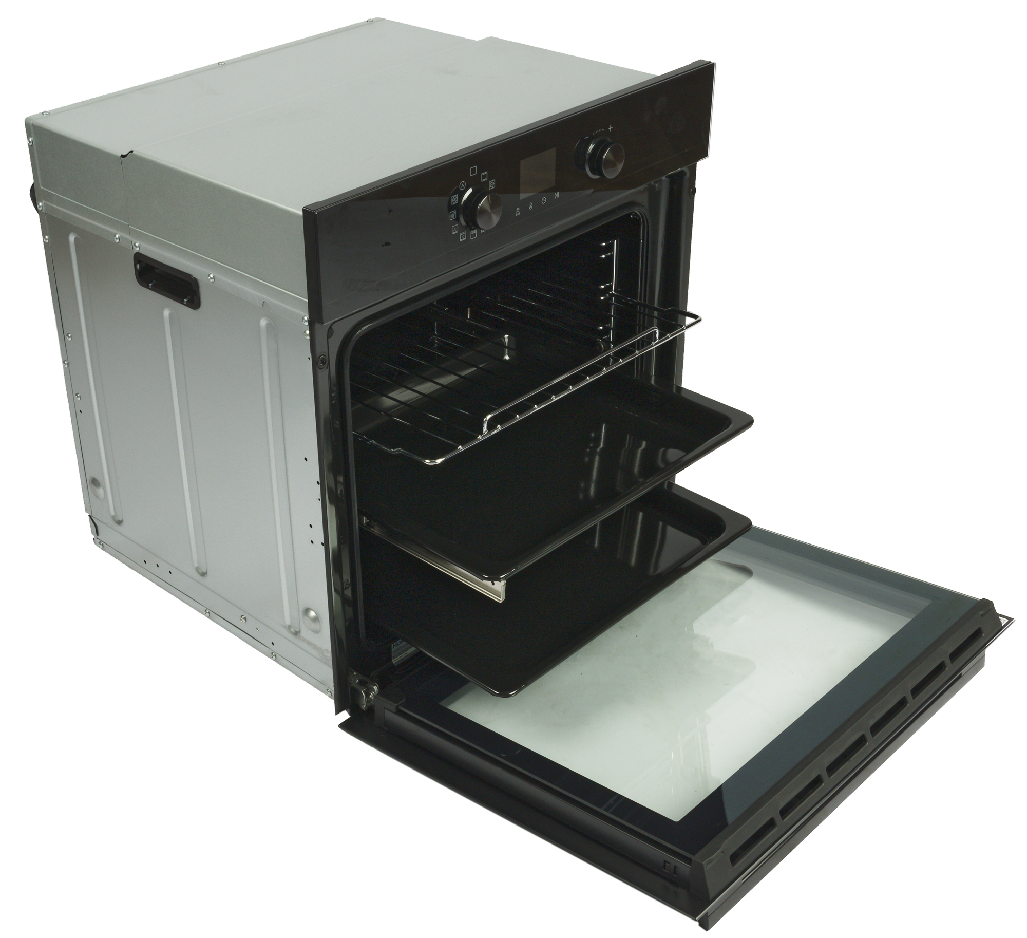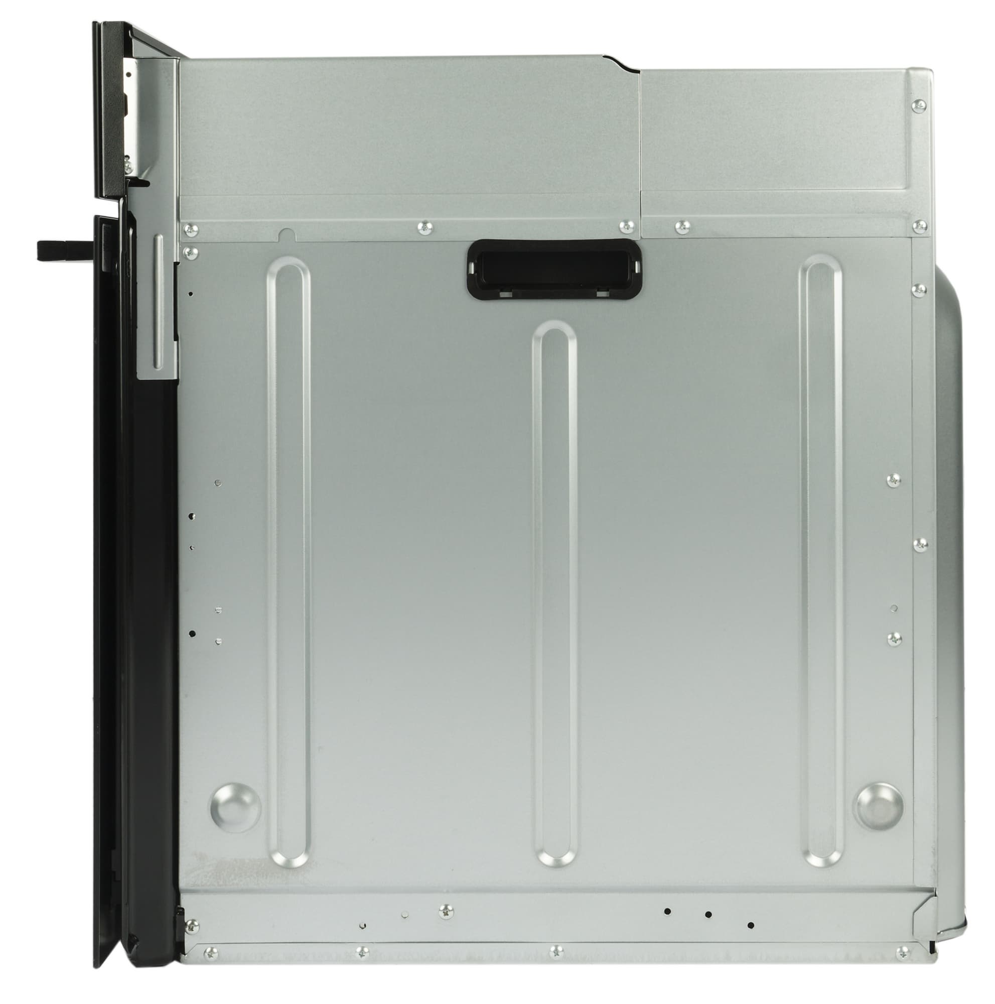 На внешних боковых стенках духовки выштамповки и ручки в виде углублений с пластиковыми вставками для удобства переноски.