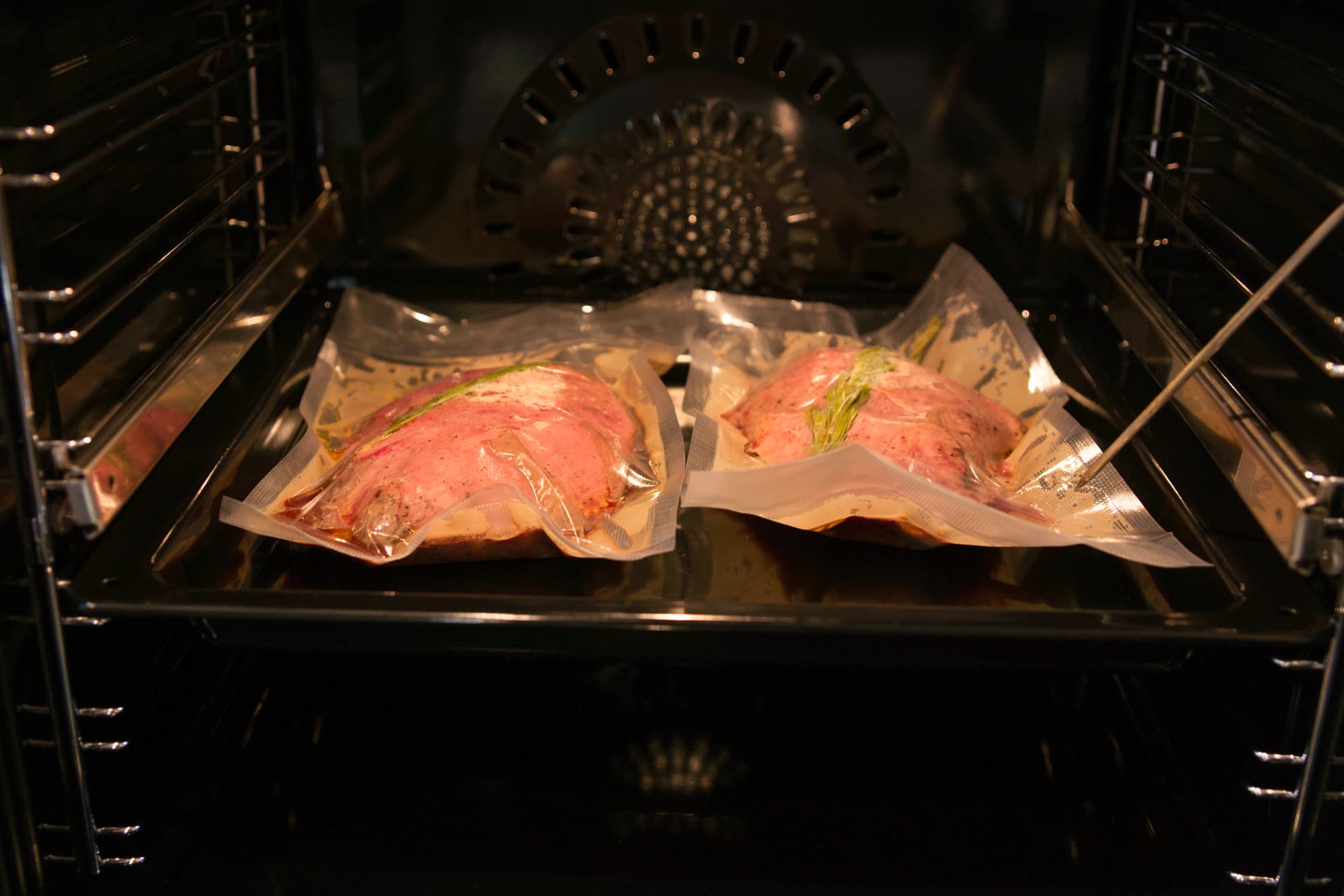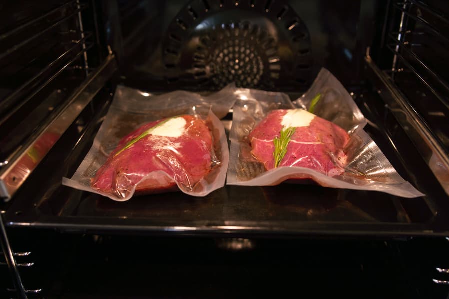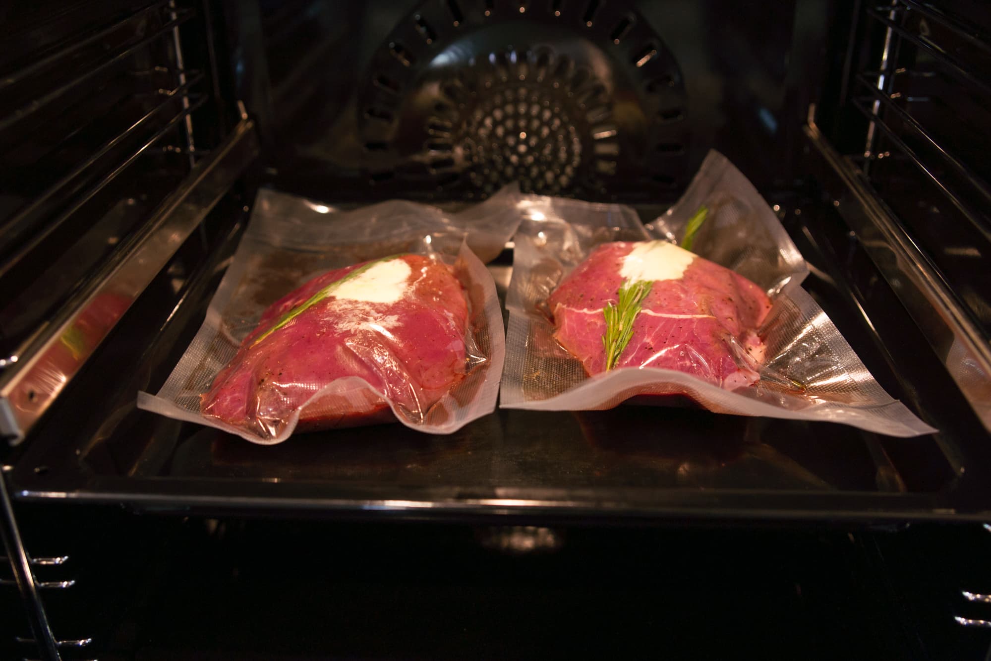 Килограммовый кусок бескостной говядины разделили на две части, натерли куски солью и перцем, уложили в специальные пакеты, добавили к ним по паре веточек розмарина и сливочное масло. С помощью вакууматора откачали воздух и герметично запаяли. Включили духовой шкаф в режиме Приготовление в вакууме. Готовить мясо планировалось на 58 °C, но оказалось, что минимум в этом режиме составляет 60 °C. Разница в два градуса для нас была не критичной, но если в планах готовить блюда су-вид при меньшей температуре, этот момент нужно иметь в виду. Для контроля уровня нагрева разместили в камере термощуп, так чтобы конец спицы находился в воздухе.