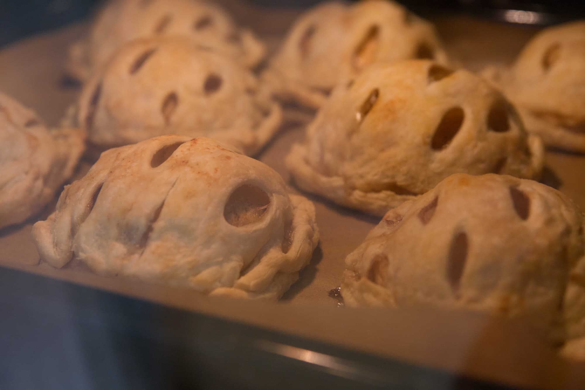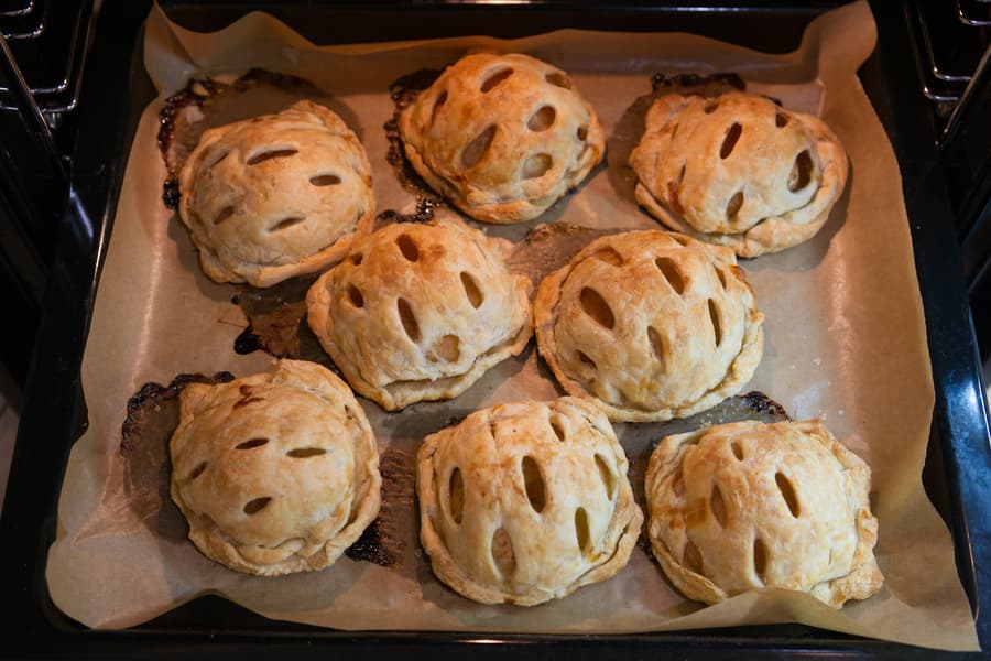 Тесто разделили на 16 частей, аккуратно раскатали их, чтобы не повредить текстуру и не лишить будущие изделия воздушности. На 8 раскатанных квадратах сделали продольные надрезы. Пока духовка разогревалась до 180 °C, на противень выложили 8 кусочков теста (тех, что без надрезов), на них половинки очищенных от кожуры и семечек яблок, смазали их медовой смесью и накрыли оставшимися кусочками теста, крепко защипнув края будущих слоек.